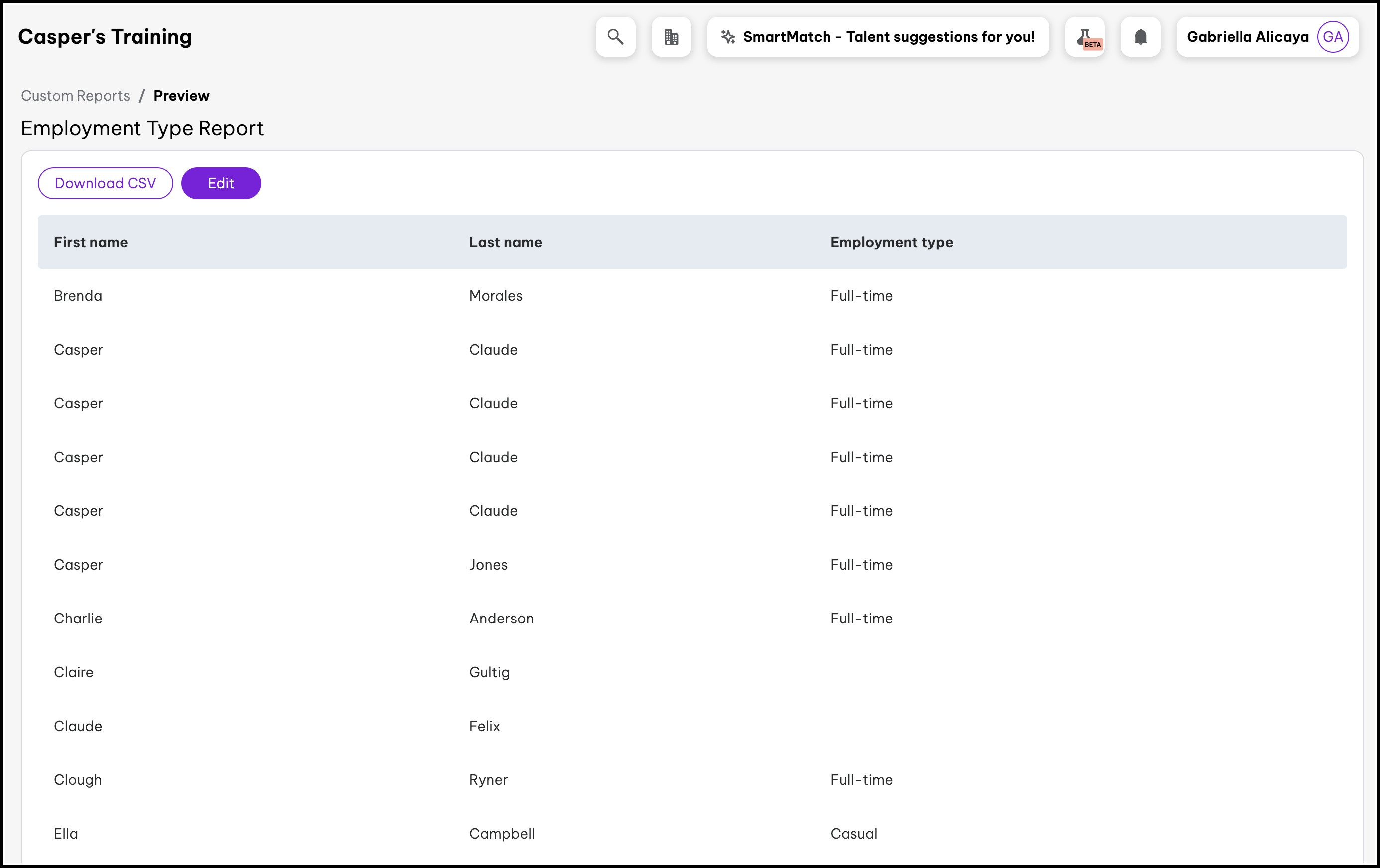 You will now see your employment type report on your screen. To read more information on how to edit, download, and delete a custom report, refer to the following article.