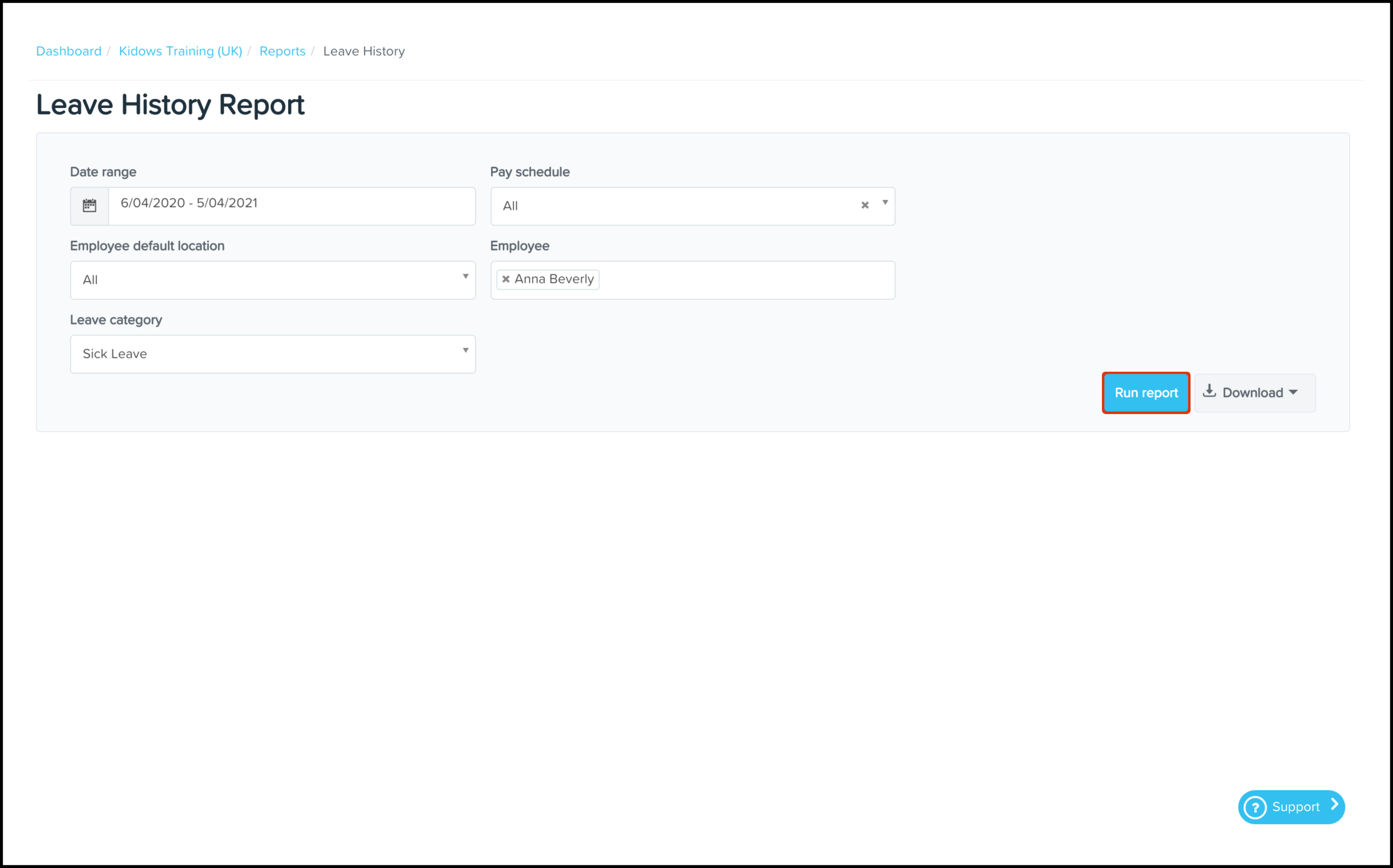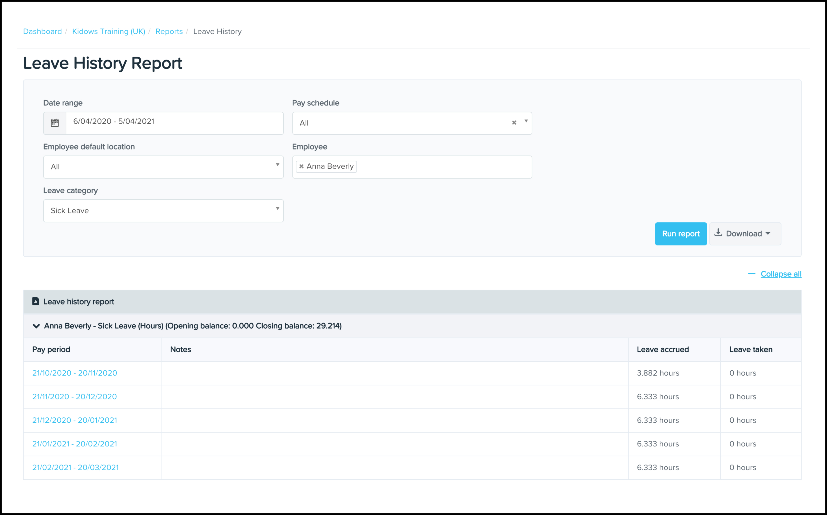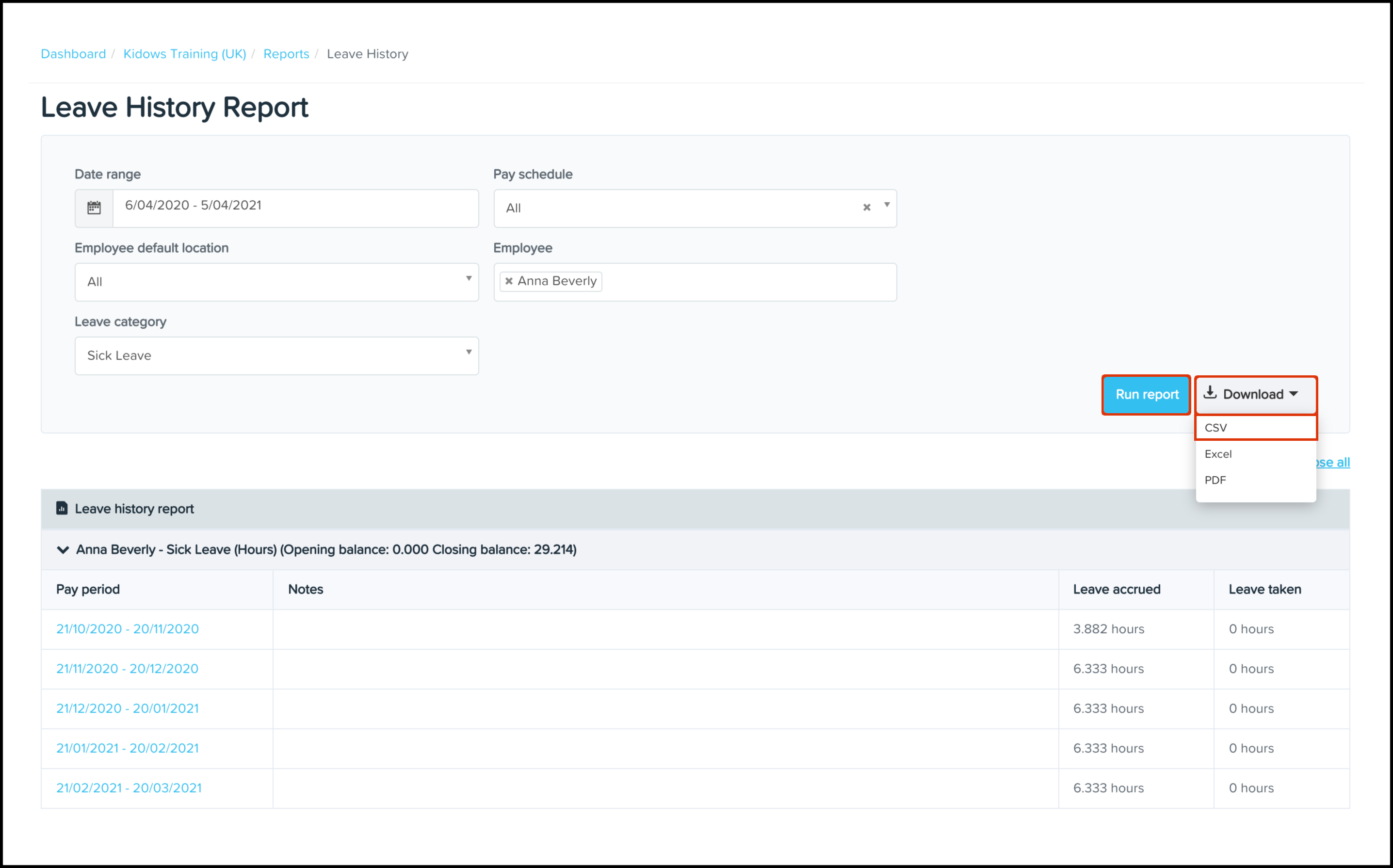The Leave History Reporting feature allows you to view the leave requests taken within your organisation. You can see details such as which pay period accrued, what type of leave, and the employees' opening and closing balances. You can also use this feature to download an excel file of this data or save the information in a printable PDF format.