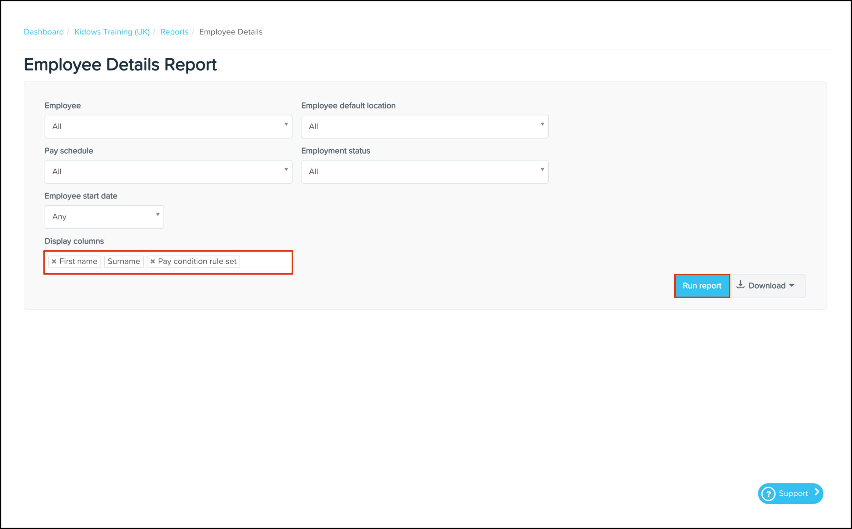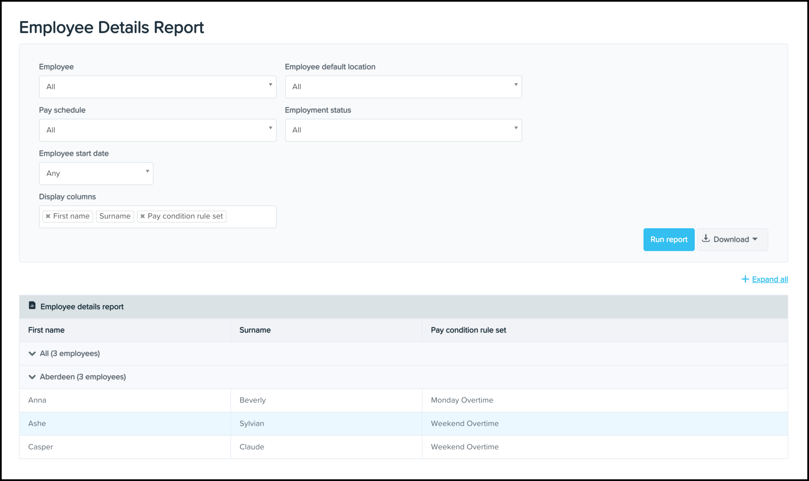 You can use the Employee Details Reporting feature to construct a report on the pay condition rule sets assigned to your employees within your payroll classic platform.