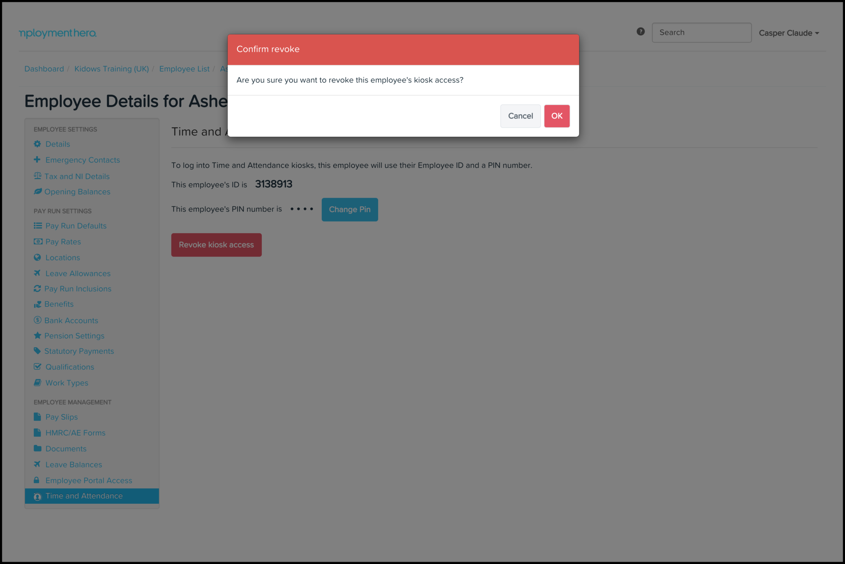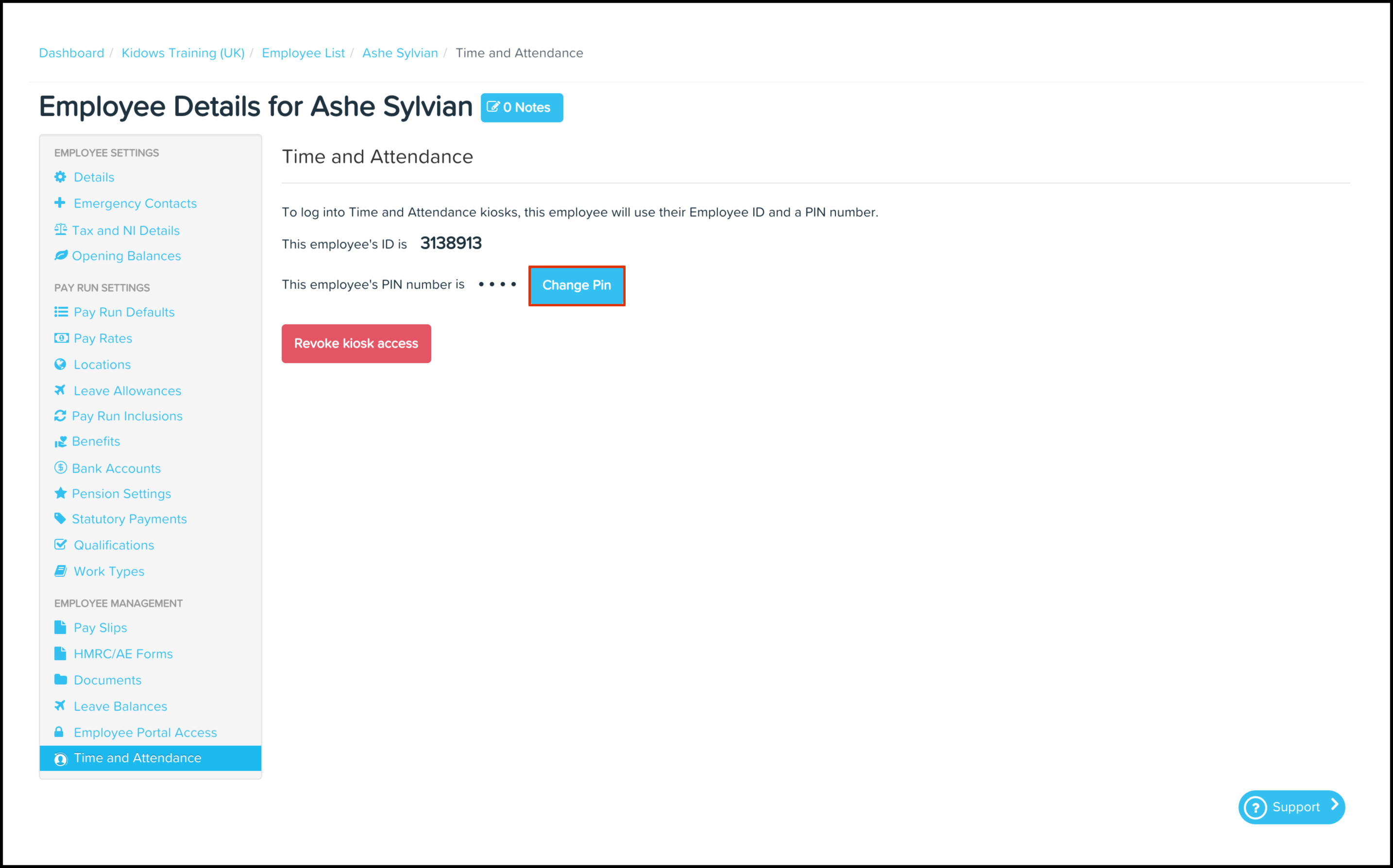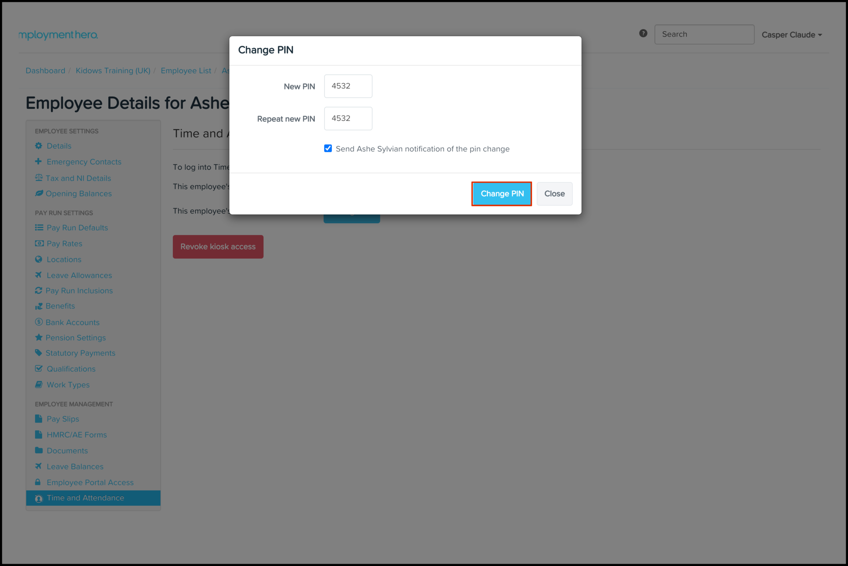 - Click on the employee who needs to have their kiosk pin changed.