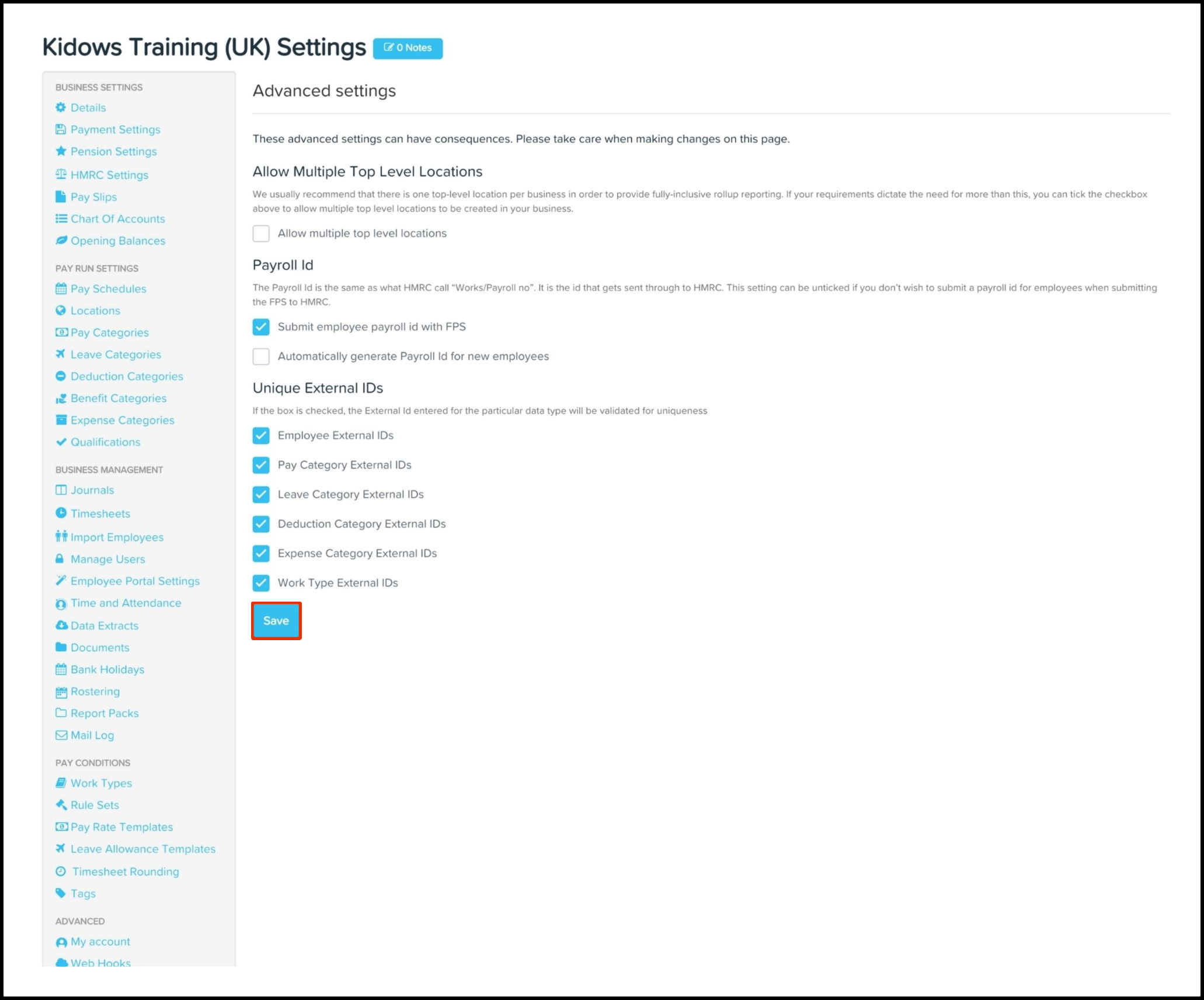 As an organisation, you may use other external software that integrates with your payroll platform via an API. To make sure the correct mapping between employees and your payroll settings, you can add an external ID against a chosen payroll feature, such as deduction categories or work types. If this is the case, you can enable this feature via the Advanced Settings feature.