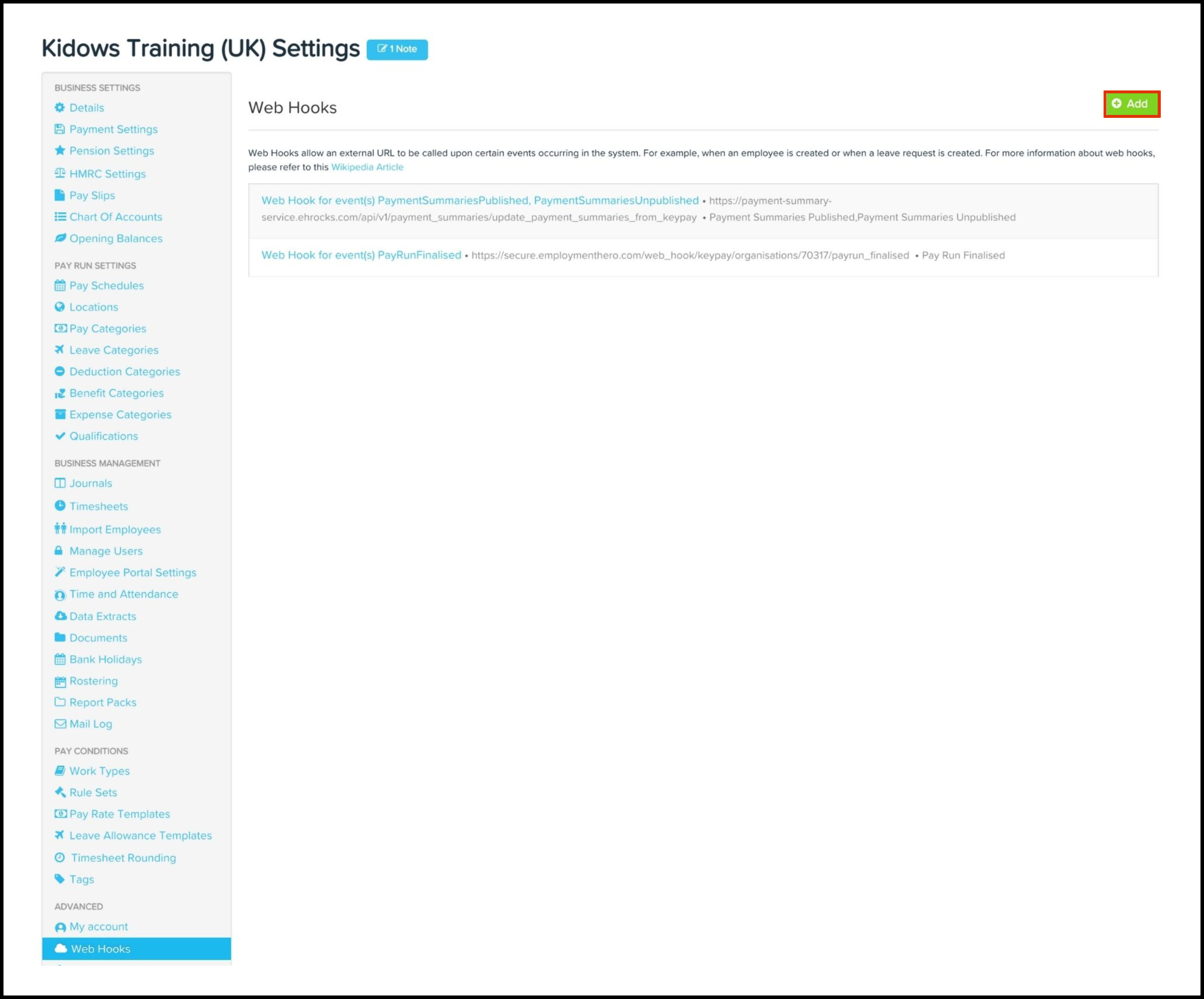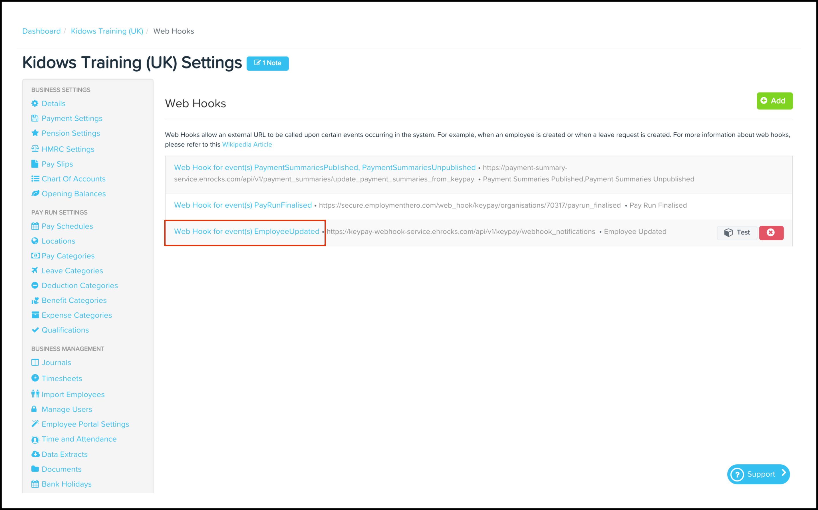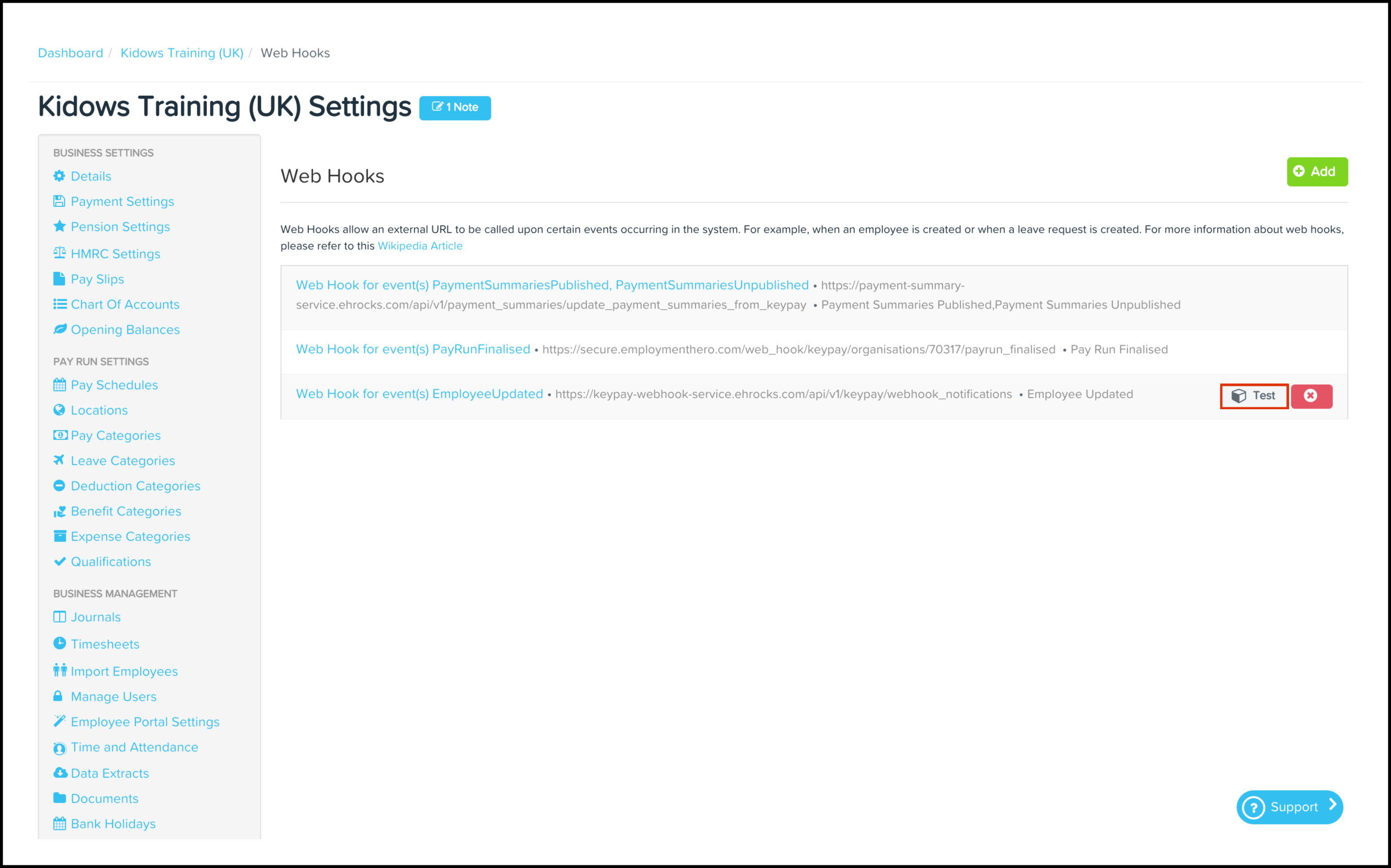 You can use the Payroll Web Hooks feature to add a new Web Hook to your organisation's payroll platform and then test out this data source to make sure it works as intended. You can also use this feature to edit any information if it changes and delete a record if it is no longer required.