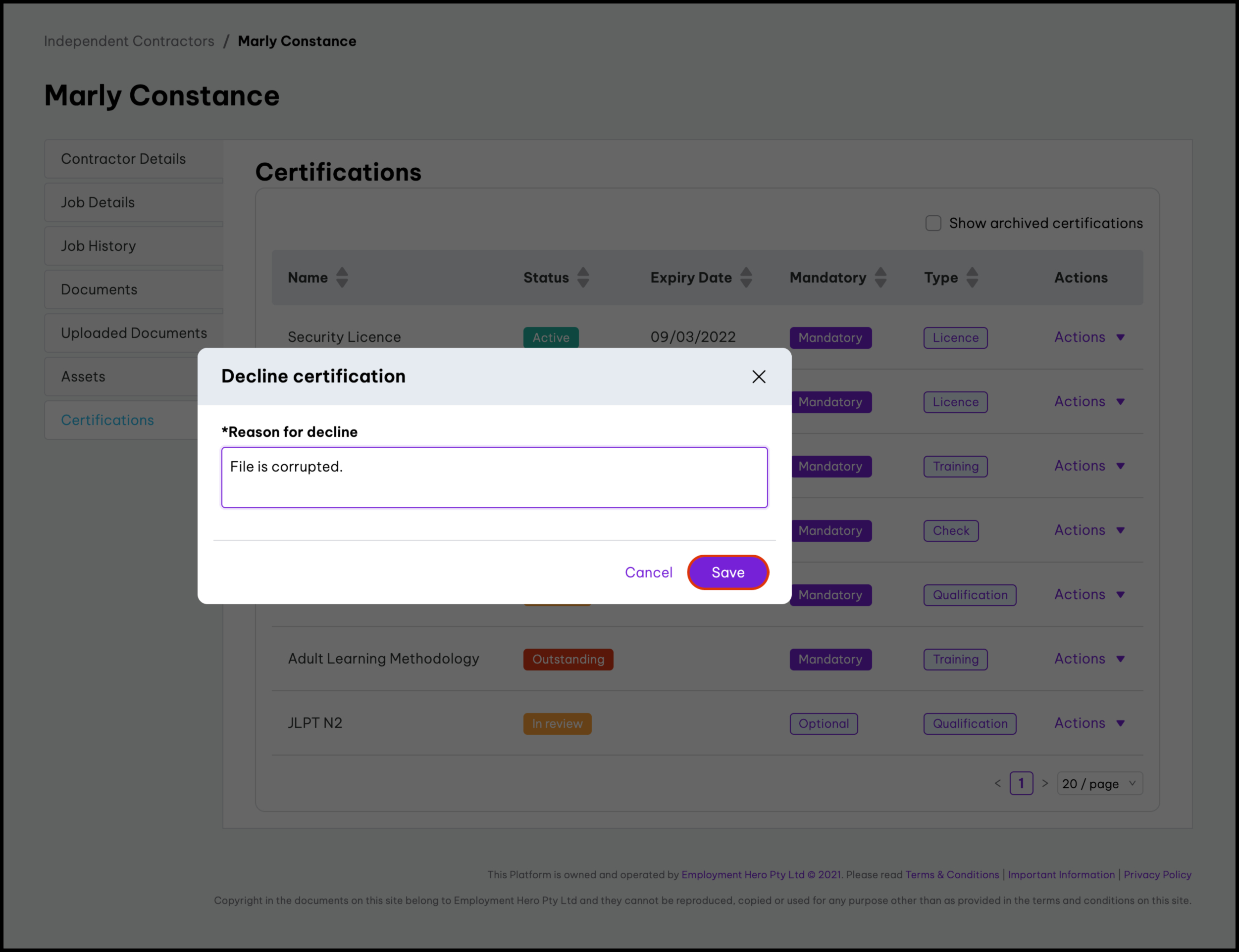 - Enter the reason for declining the certification, and click the Save button.