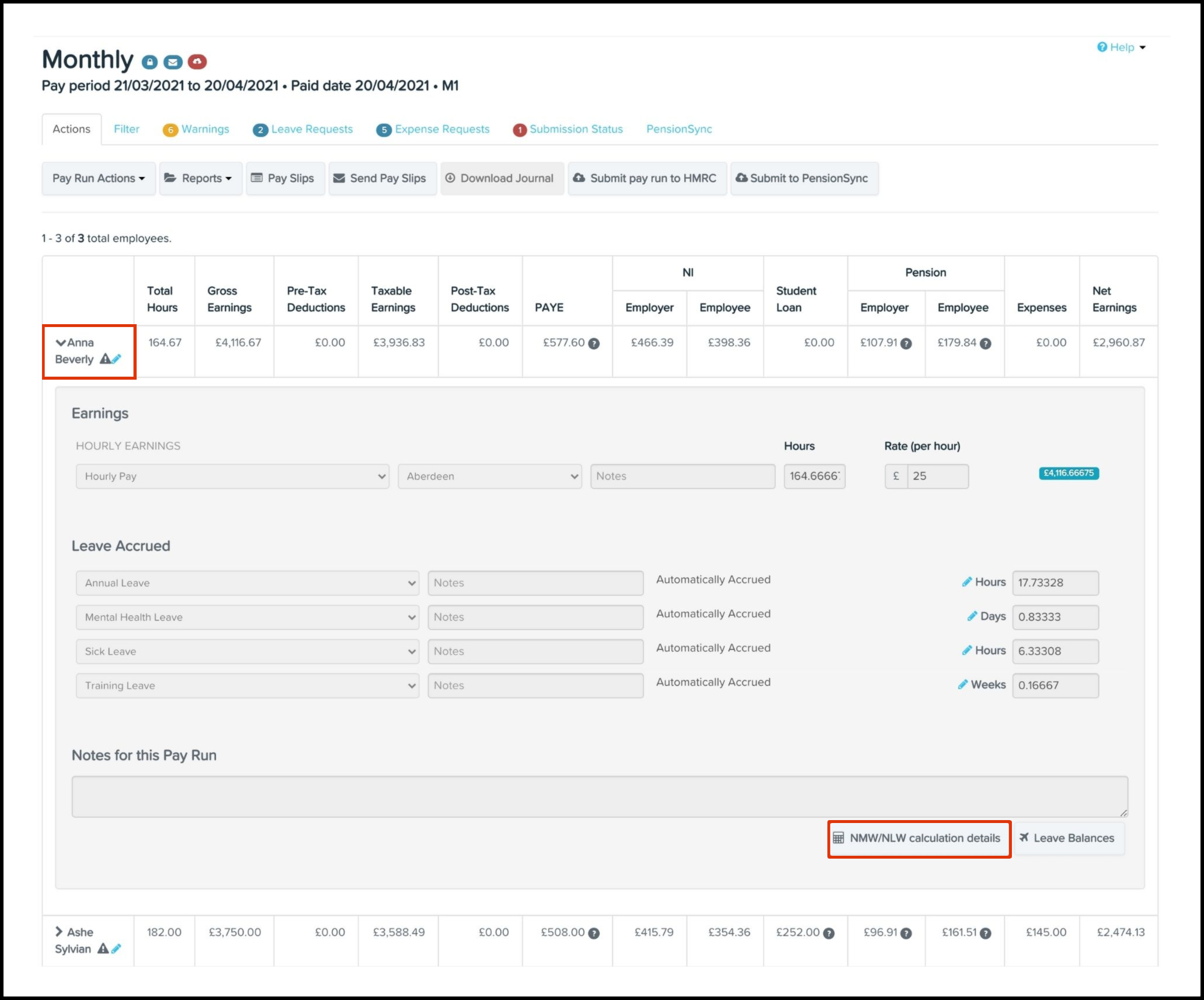 - Click on the employee's name who needs their NMW/NLW calculation viewed.