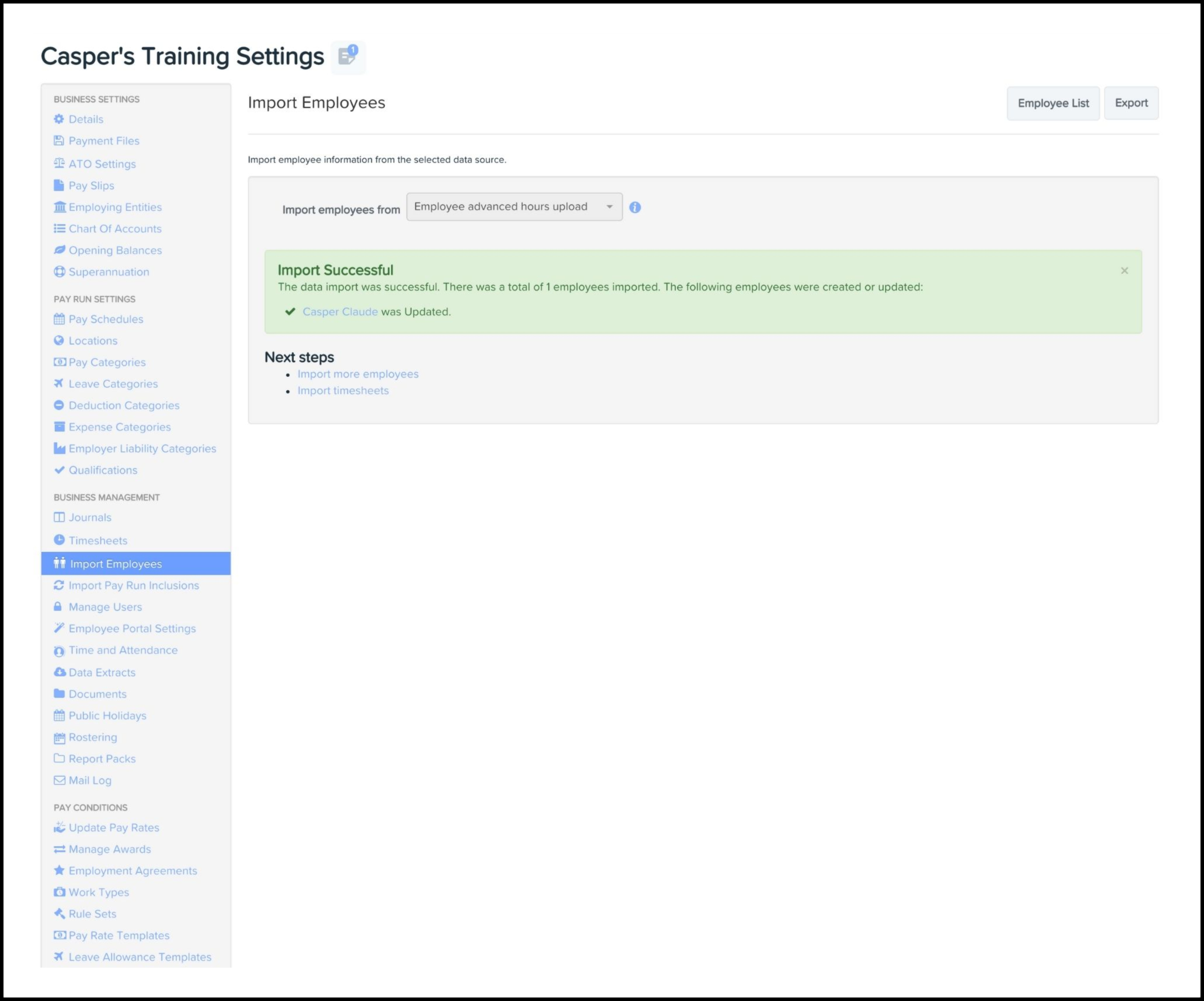 You can use the Employee Importing feature within the Payroll Settings module to import in bulk your advanced work hours' data. You will need to undertake the below steps via your Employment Hero Payroll platform.