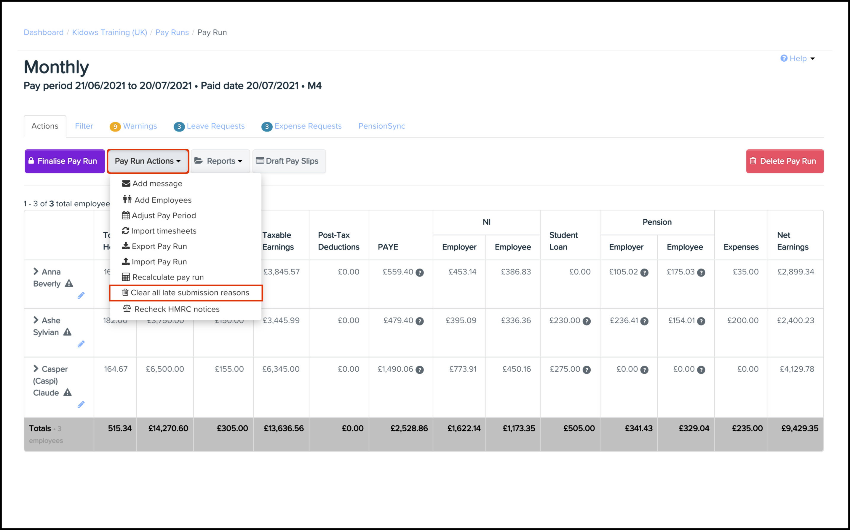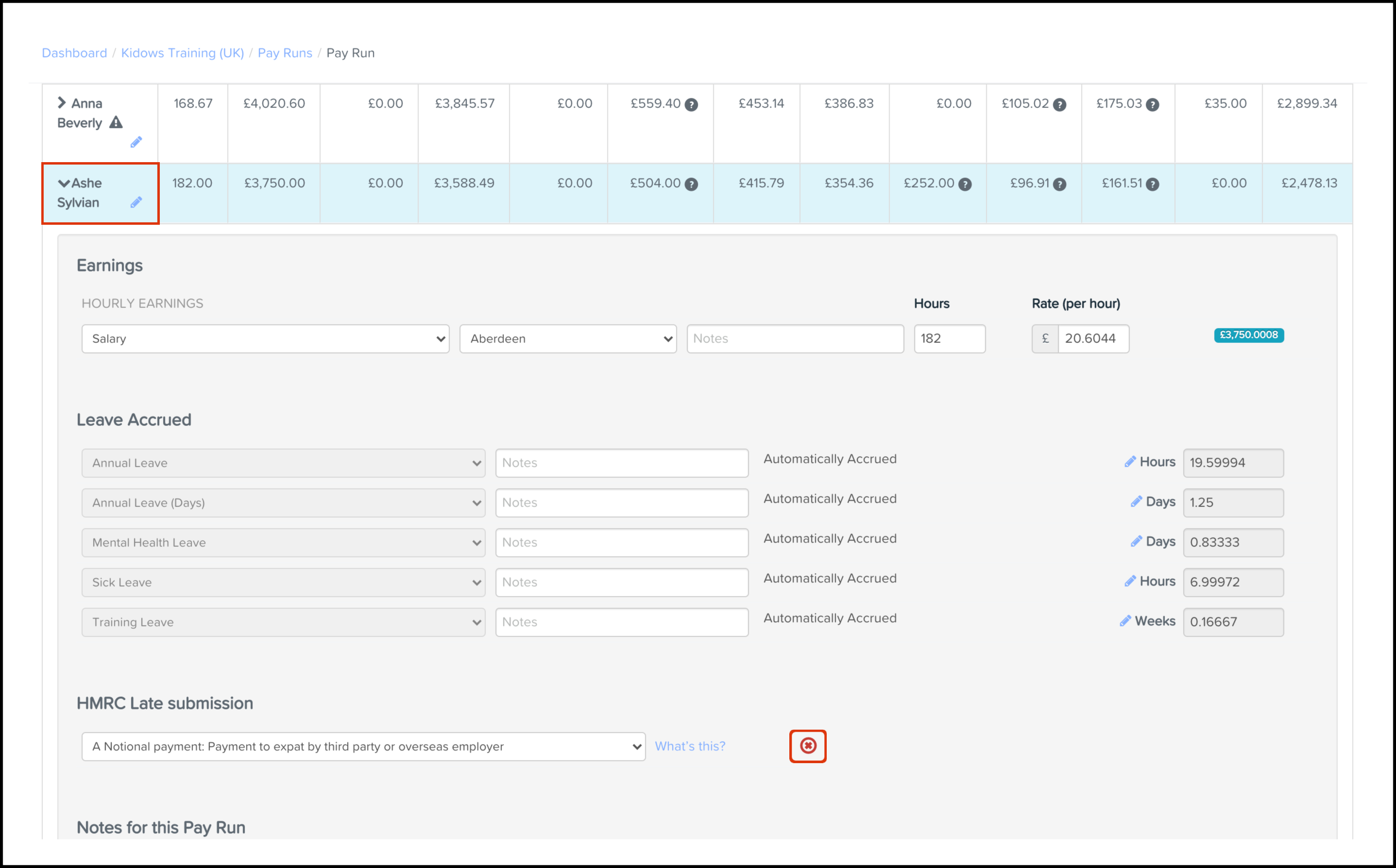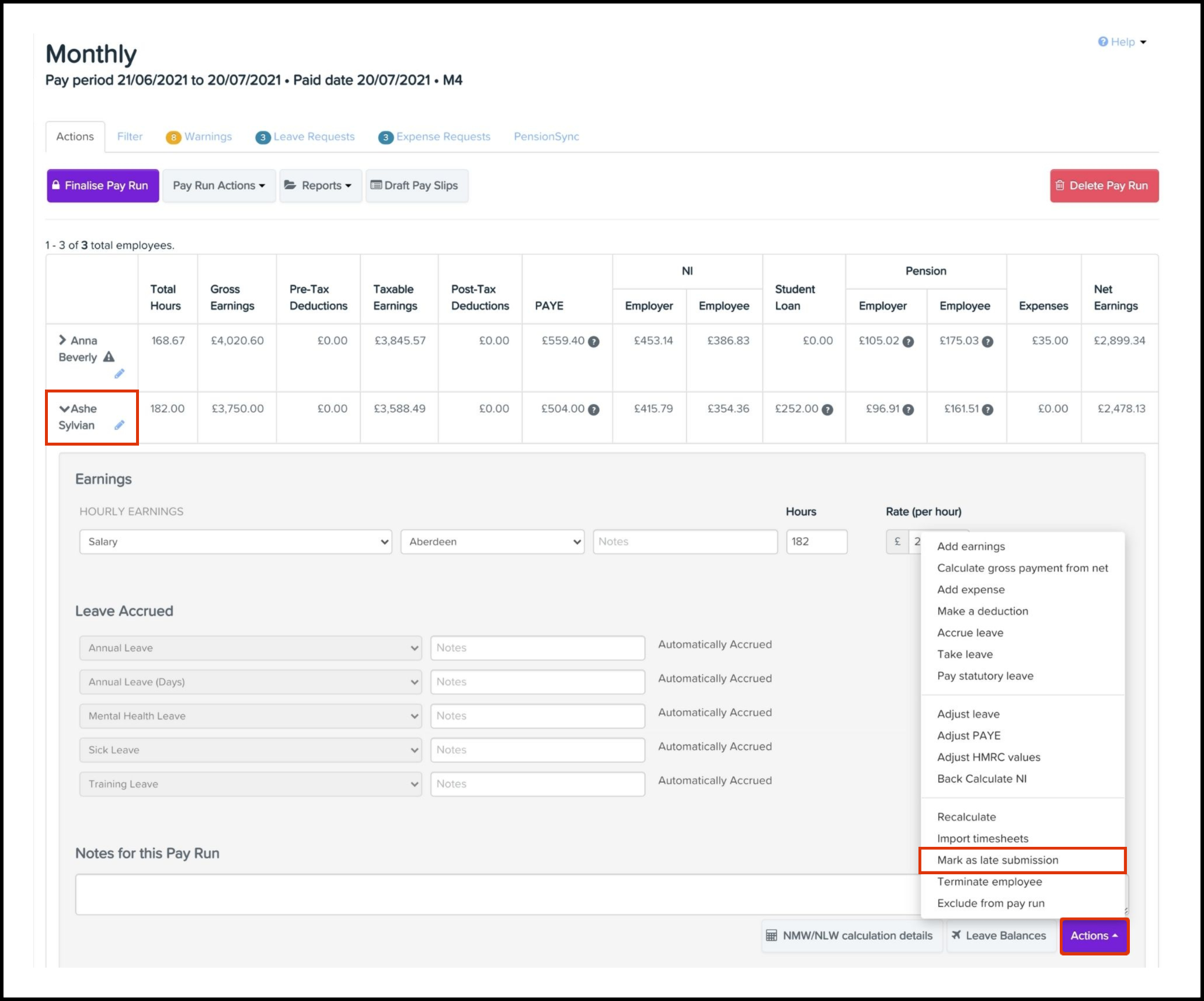 You can use the HMRC Late Submission feature within the Pay Run module to send an employee HMRC late submission notice, either for individual employees or for all employees in bulk. You can also use this feature to delete this notice either individually or in bulk if you added it in error.
