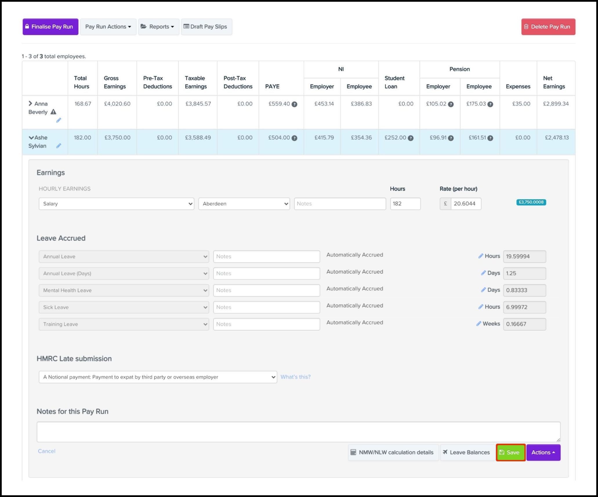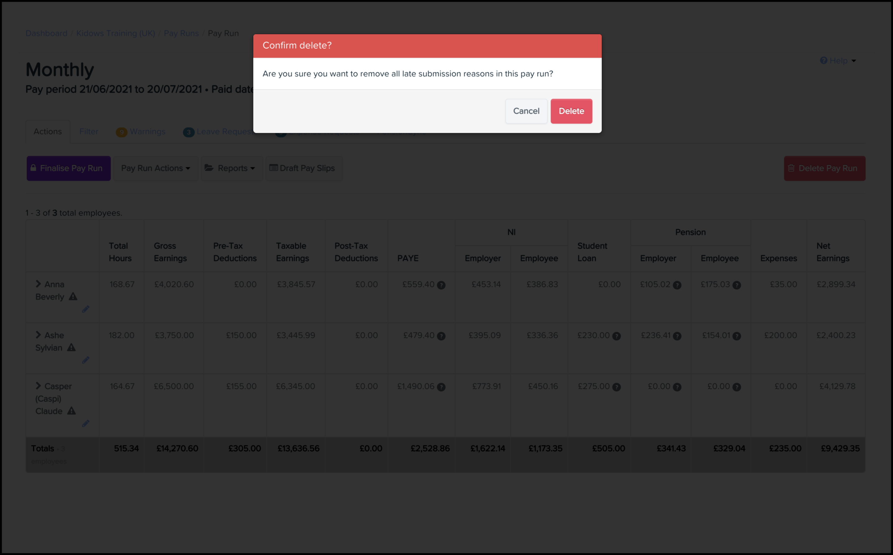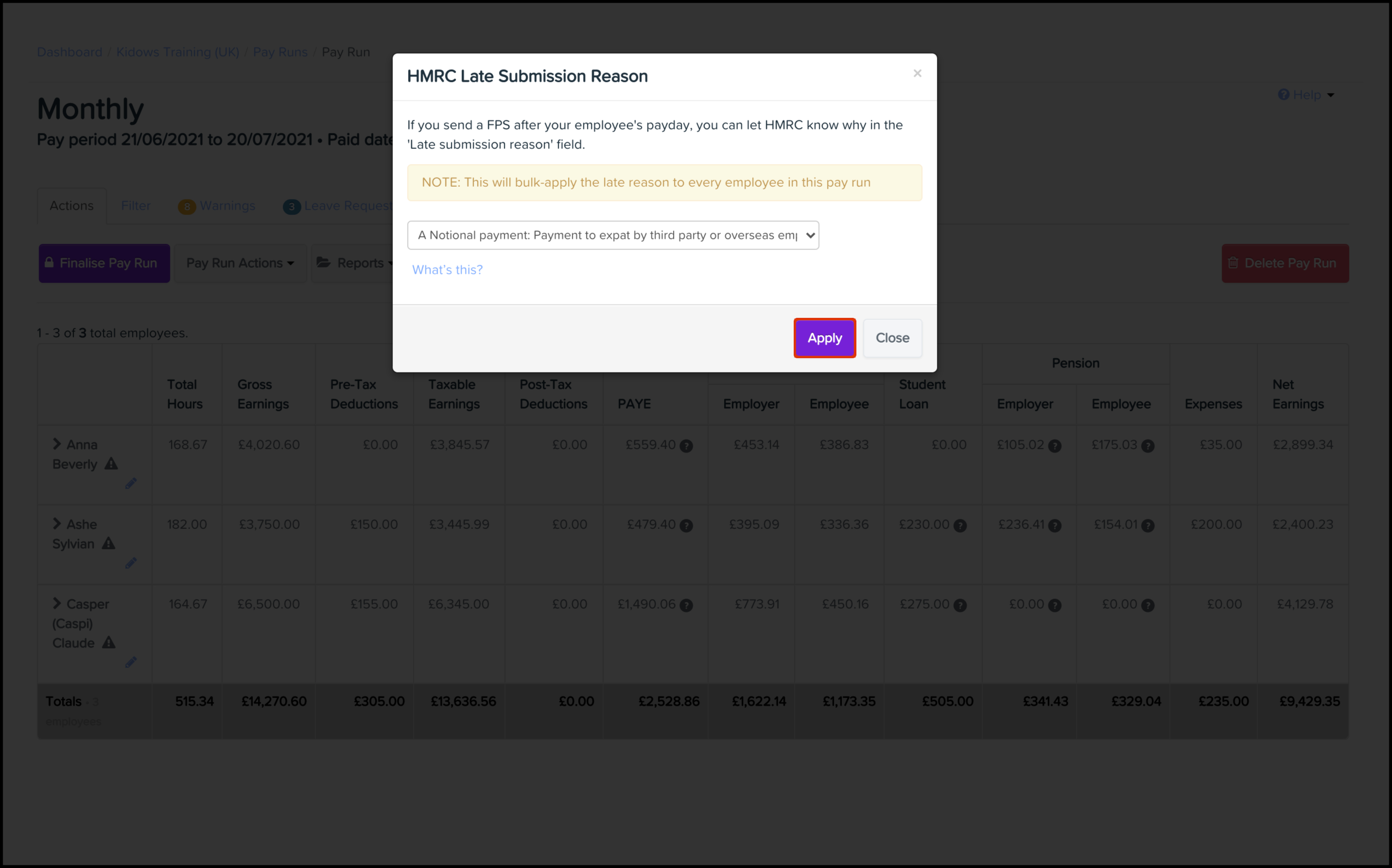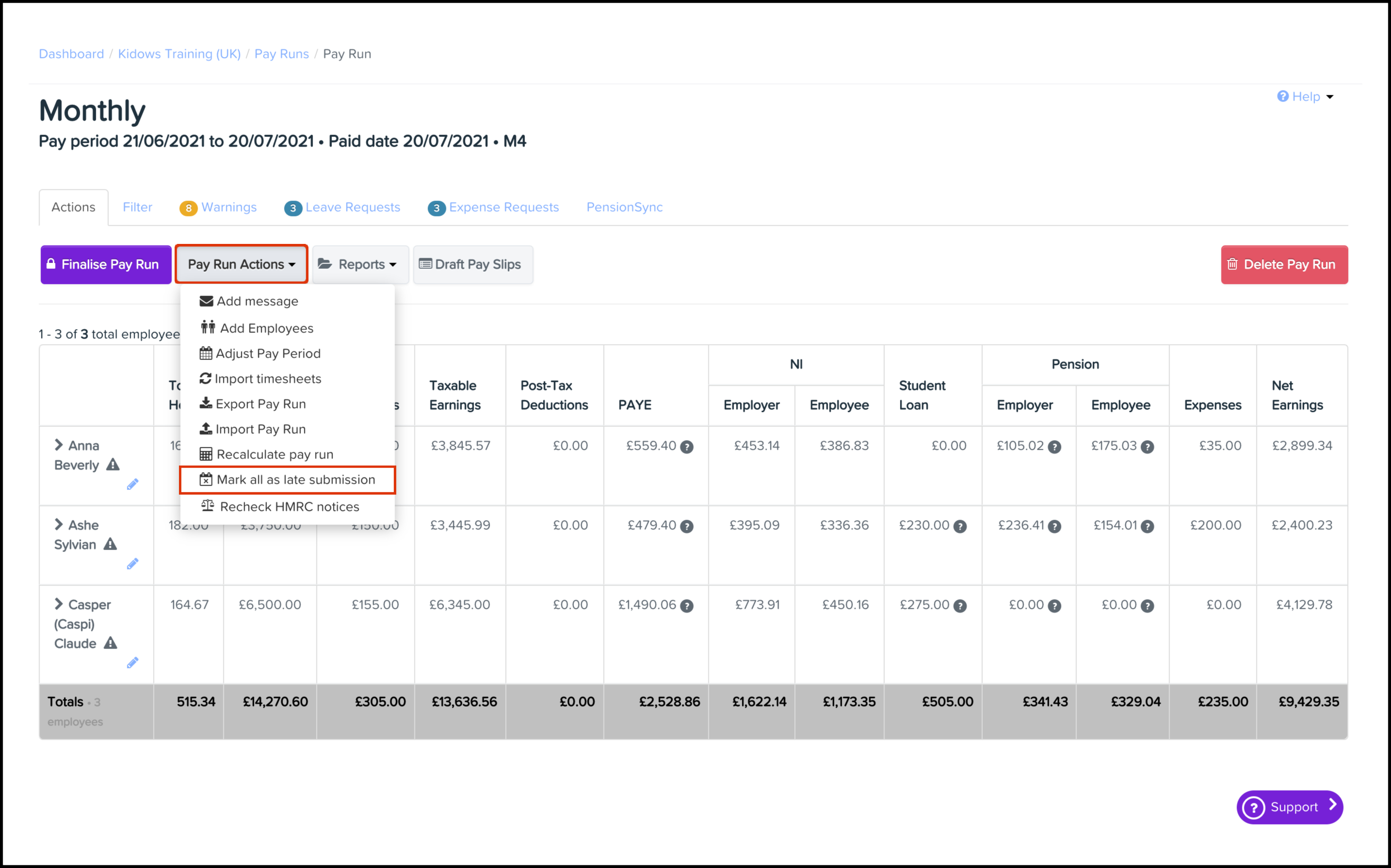 You can use the HMRC Late Submission feature within the Pay Run module to send an employee HMRC late submission notice, either for individual employees or for all employees in bulk. You can also use this feature to delete this notice either individually or in bulk if you added it in error.