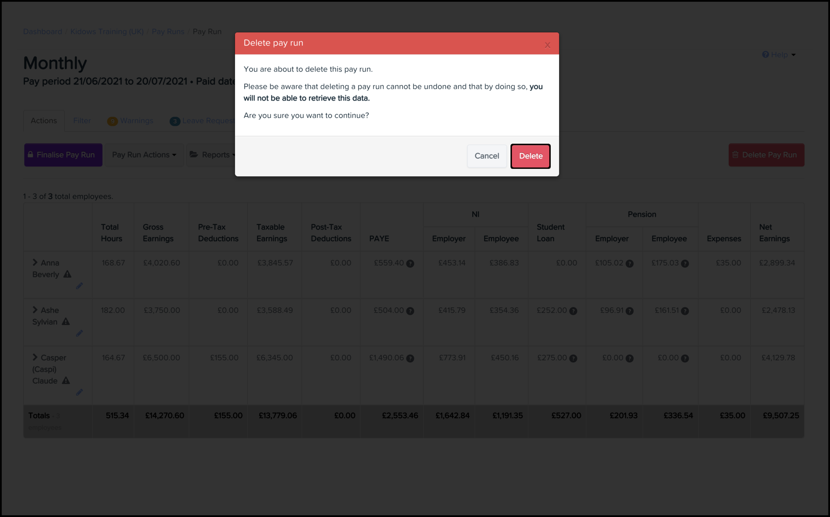 You can use the Delete functionality to remove a pay run you created in error. You will need to undertake the below steps via your Employment Hero Payroll platform.