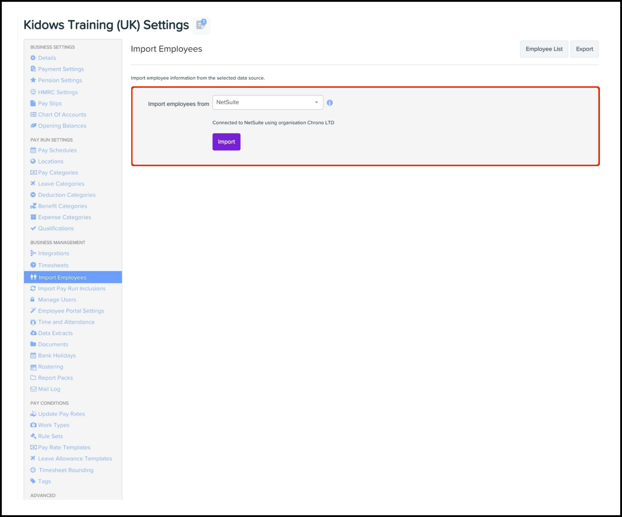 - Select the NetSuite option in the Import Employees From dropdown.