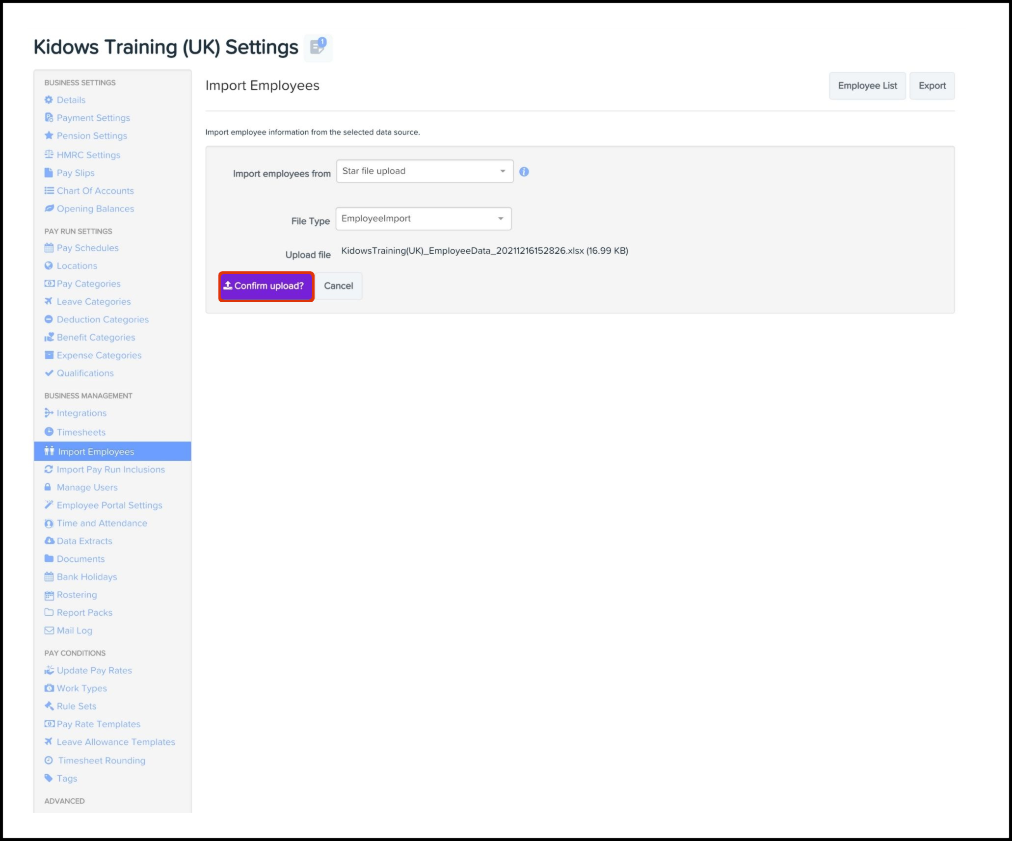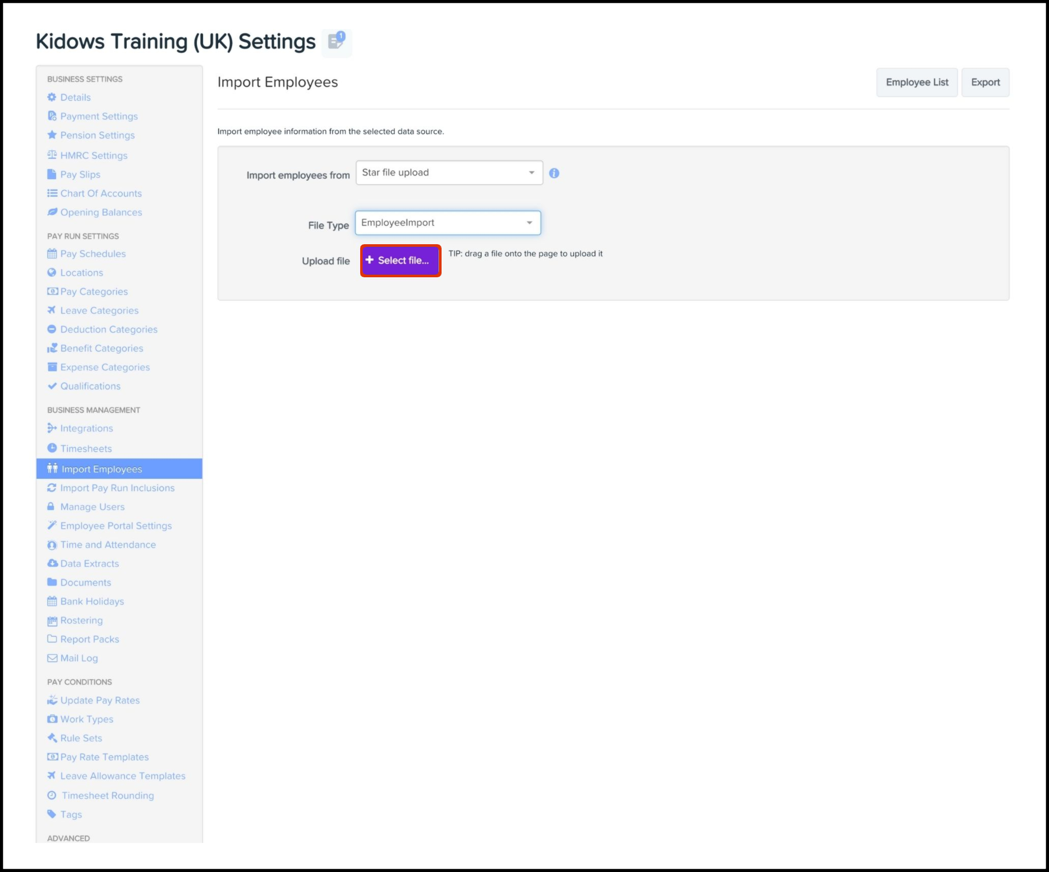 - Select the Star File Upload option in the Import Employees From drop-down.