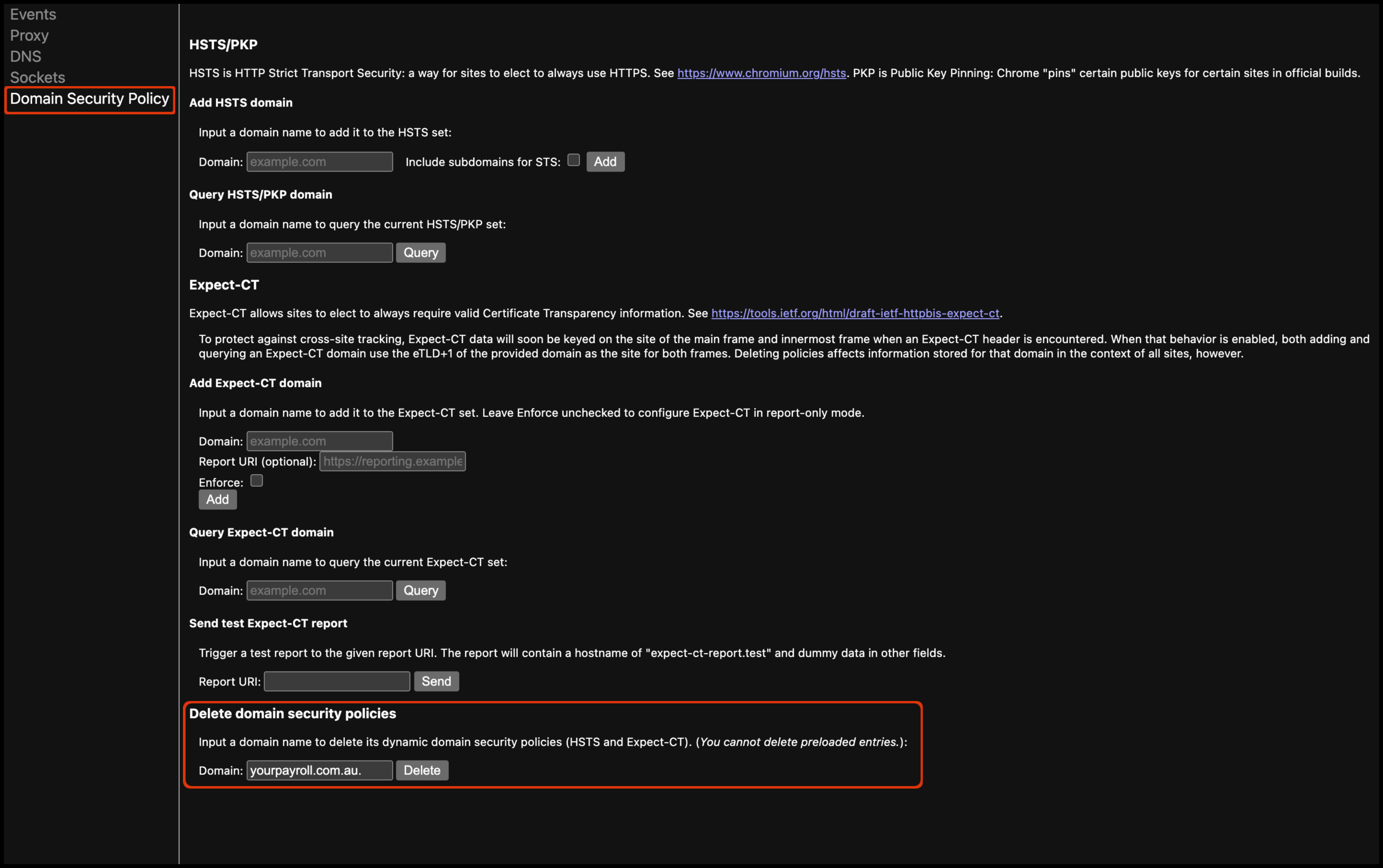 - In your Chrome browser, enter the following address chrome://net-internals/#hsts.