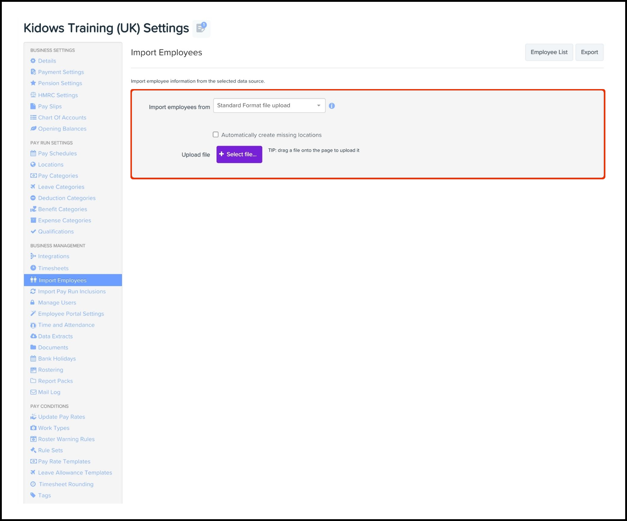 - Select the Standard Format File Upload option in the Import Employees From drop-down.