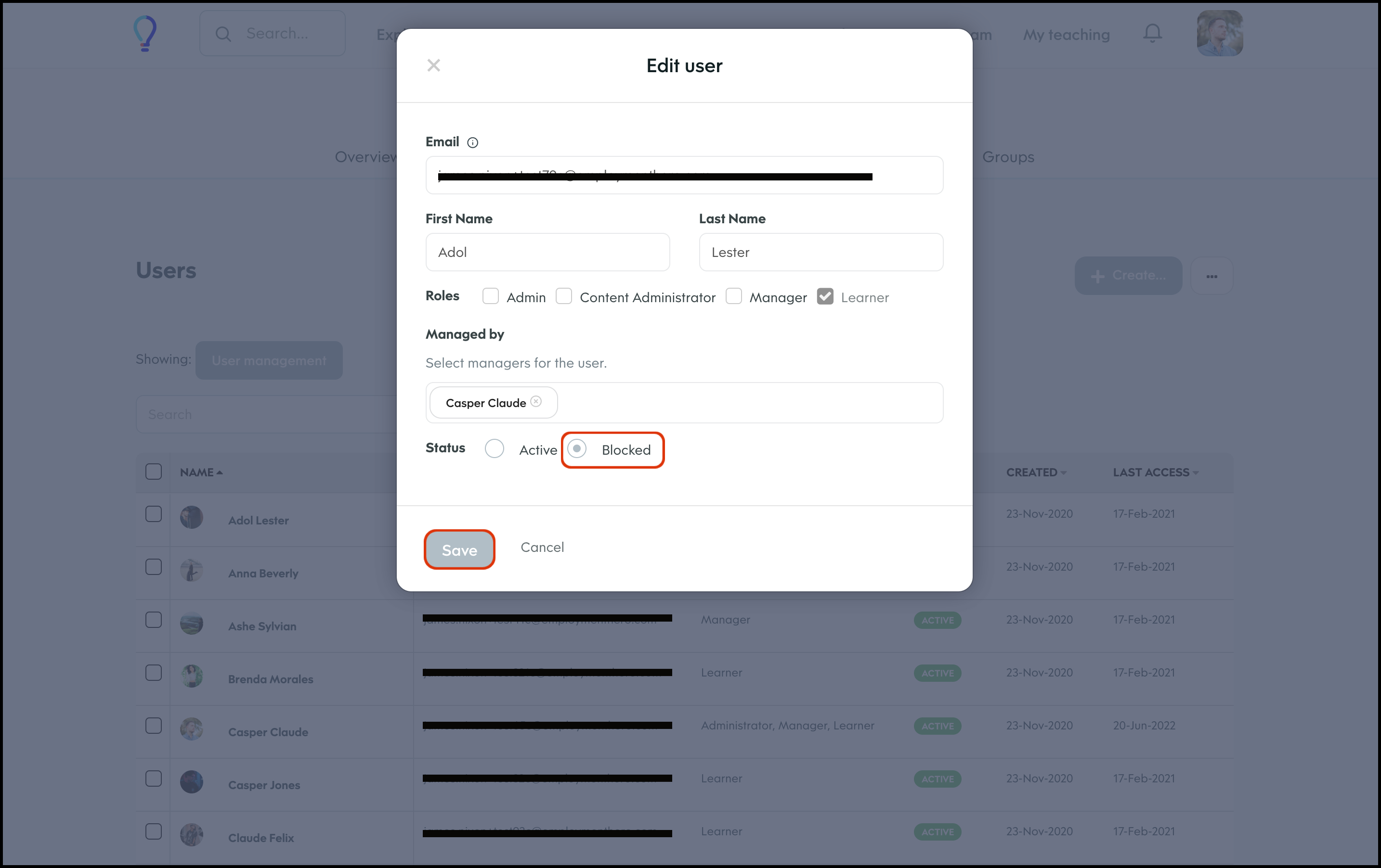 You can use the Block User feature within the User Management module to block a user and prevent them from logging into your organisation's learning platform.