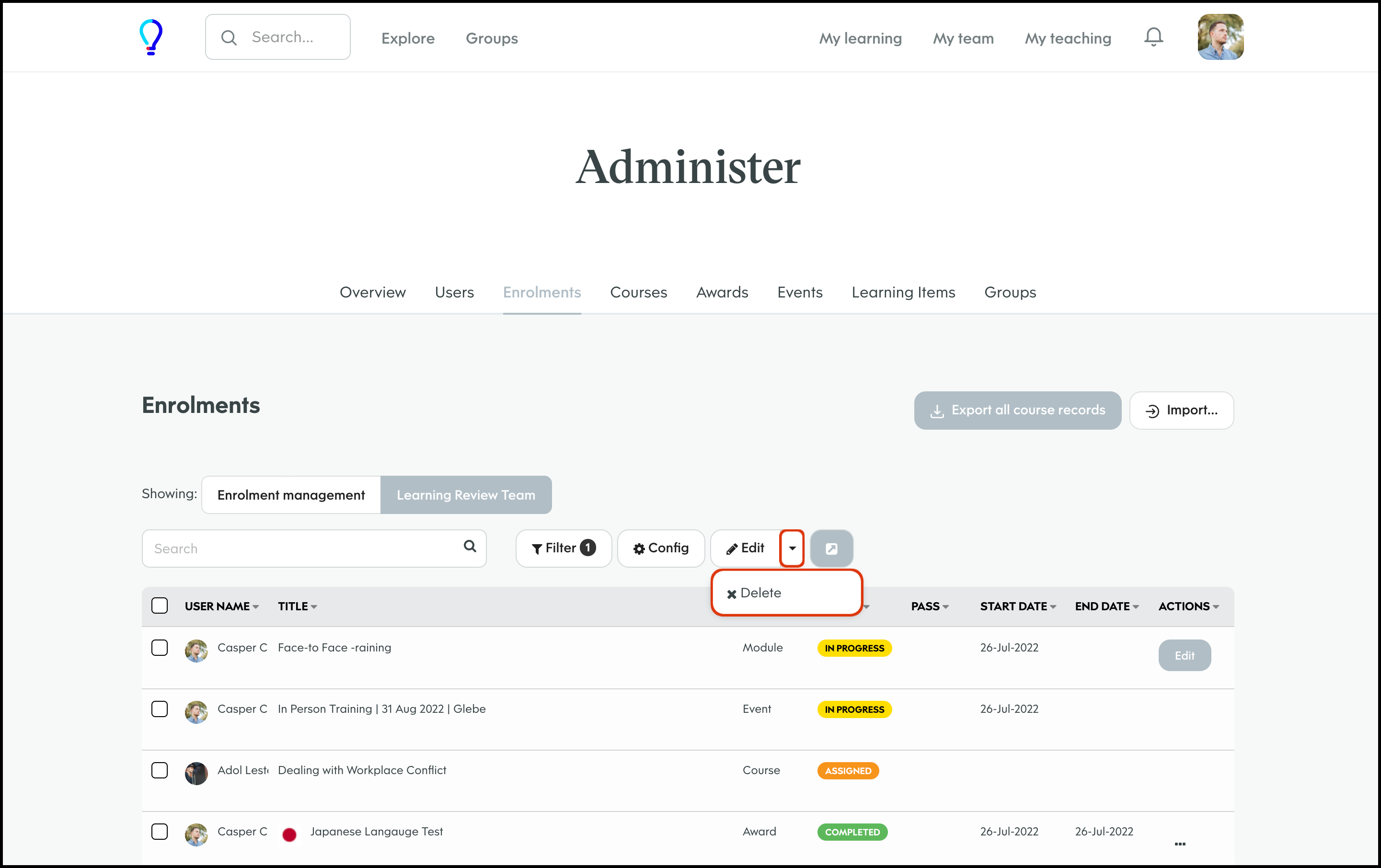 The Enrolment Management section lets you customise your report page by choosing to have the data shown in a table, calendar, or histogram. You can also customise what columns to include in each of these layouts and then save this view so you can access it again later. Finally, you can share this custom view with others on your learning platform, edit the information if it changes, and delete a record if it is no longer relevant.