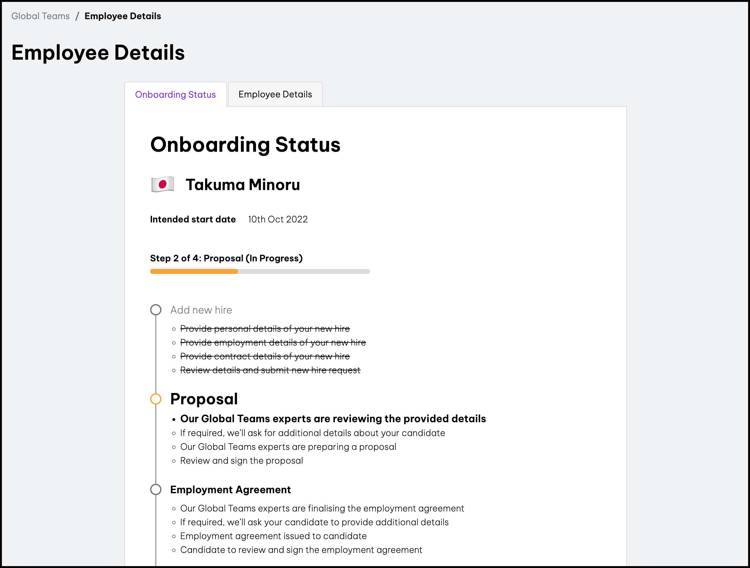 You can use the Onboarding Status page to see the status of your Global Teams employee request and how Employment Hero is progressing with your submission.