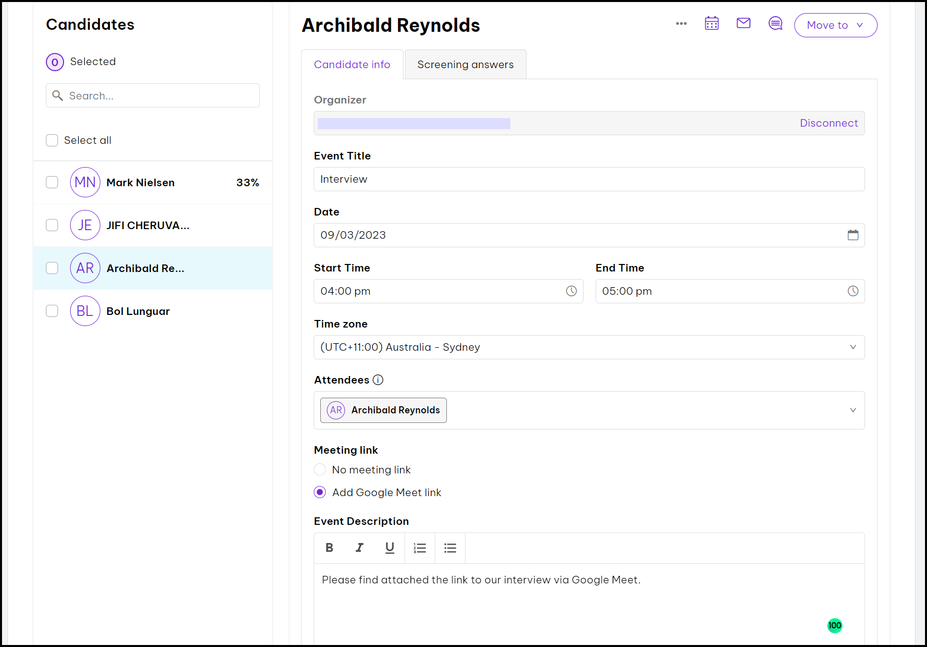 When scheduling a meeting and selecting attendees, only users with a company email address on their Employment Hero profile will appear in the Attendees list. If you want to invite other people from your organization to the interview, make sure they have a company email address added to their user profile first.