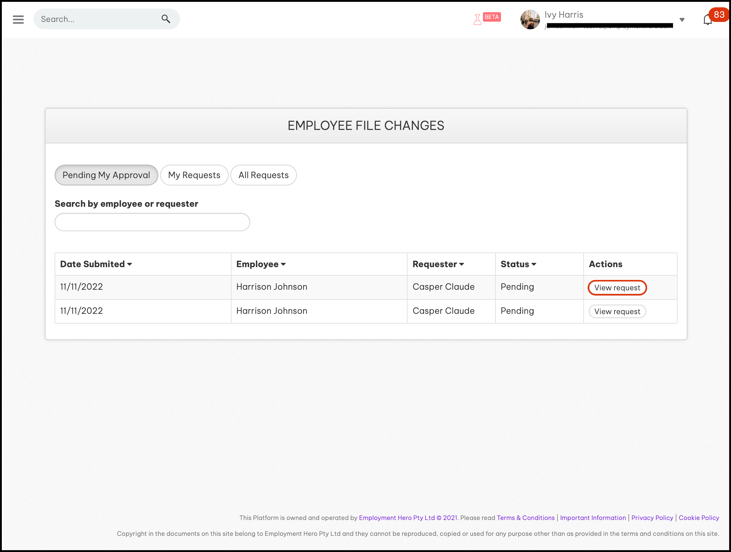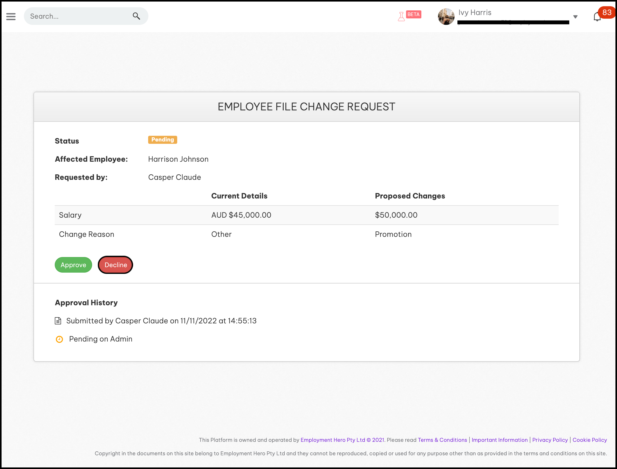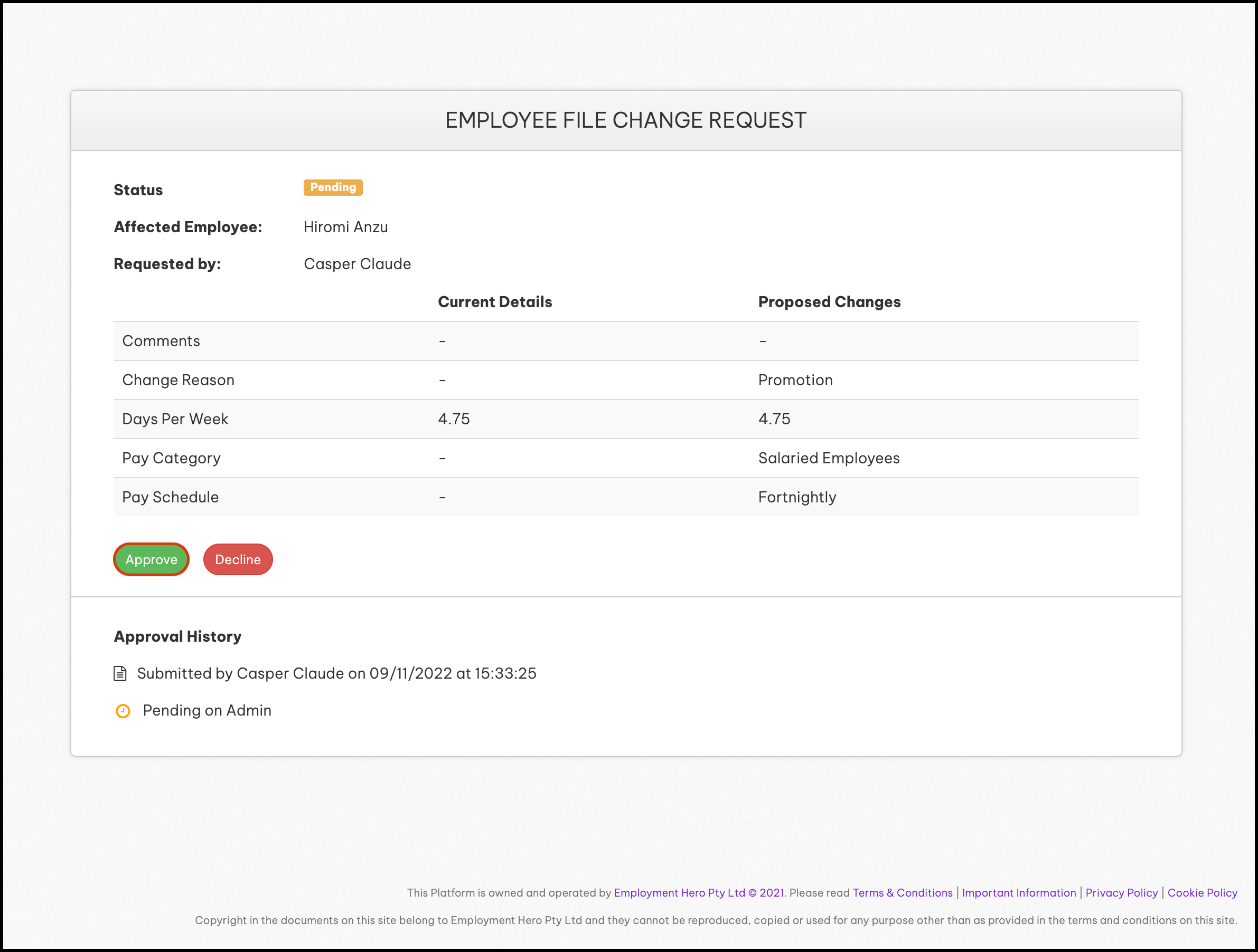 The Employee File Approvals Management feature allows you to review your organisation's employee file change requests, compare the two versions, and approve or decline the submissions. You can also use this feature to view the details of the request and cancel a submission if it is no longer needed.
