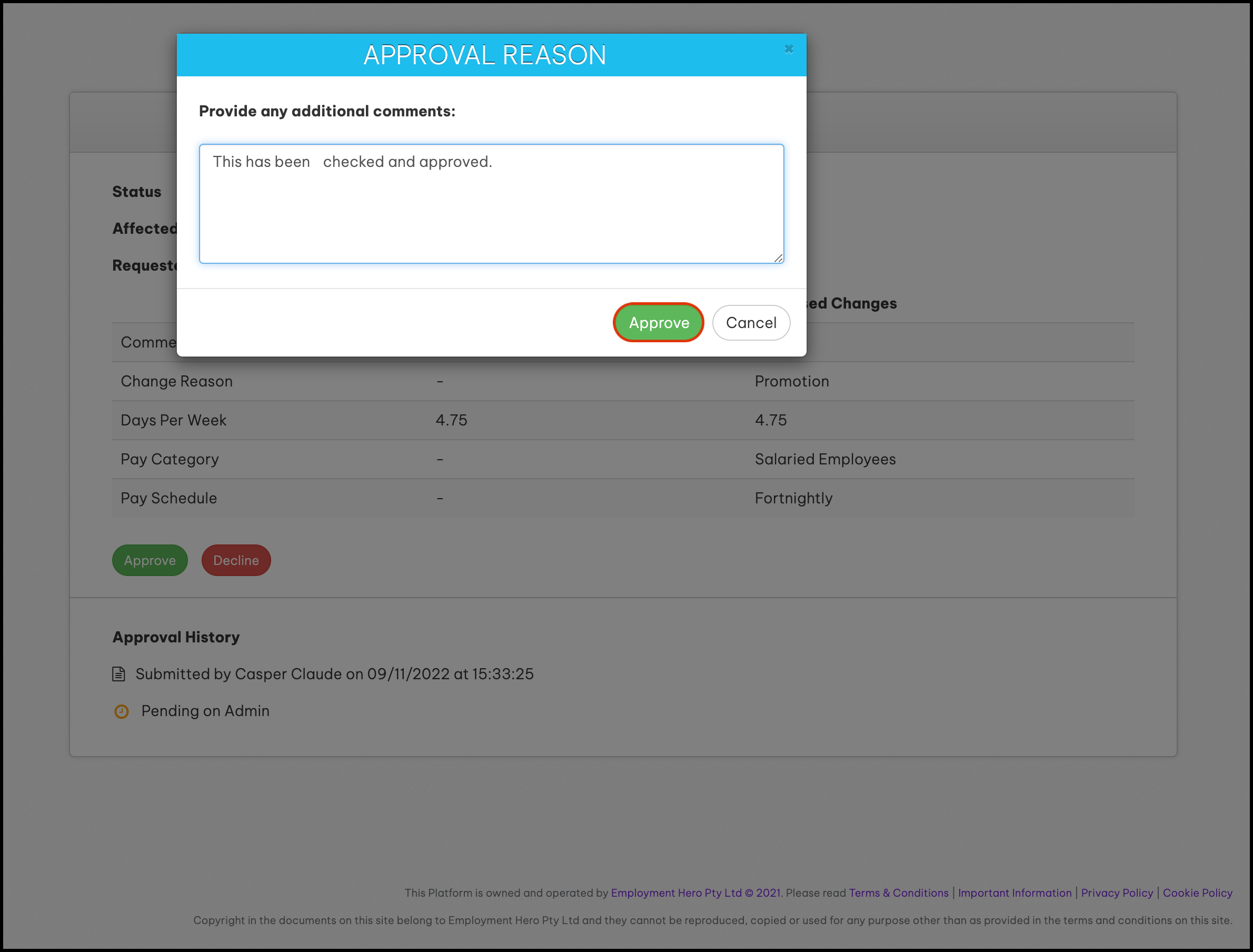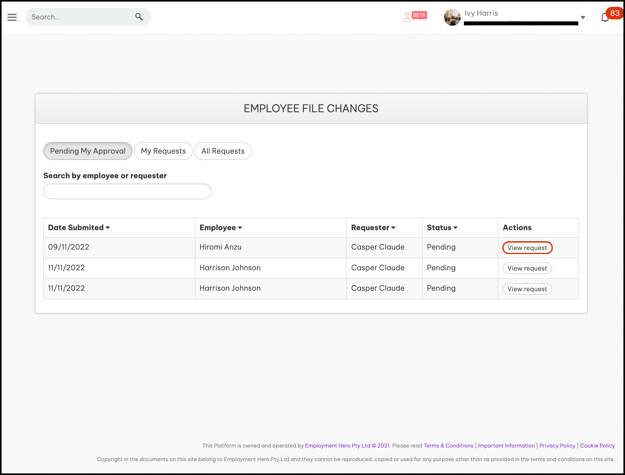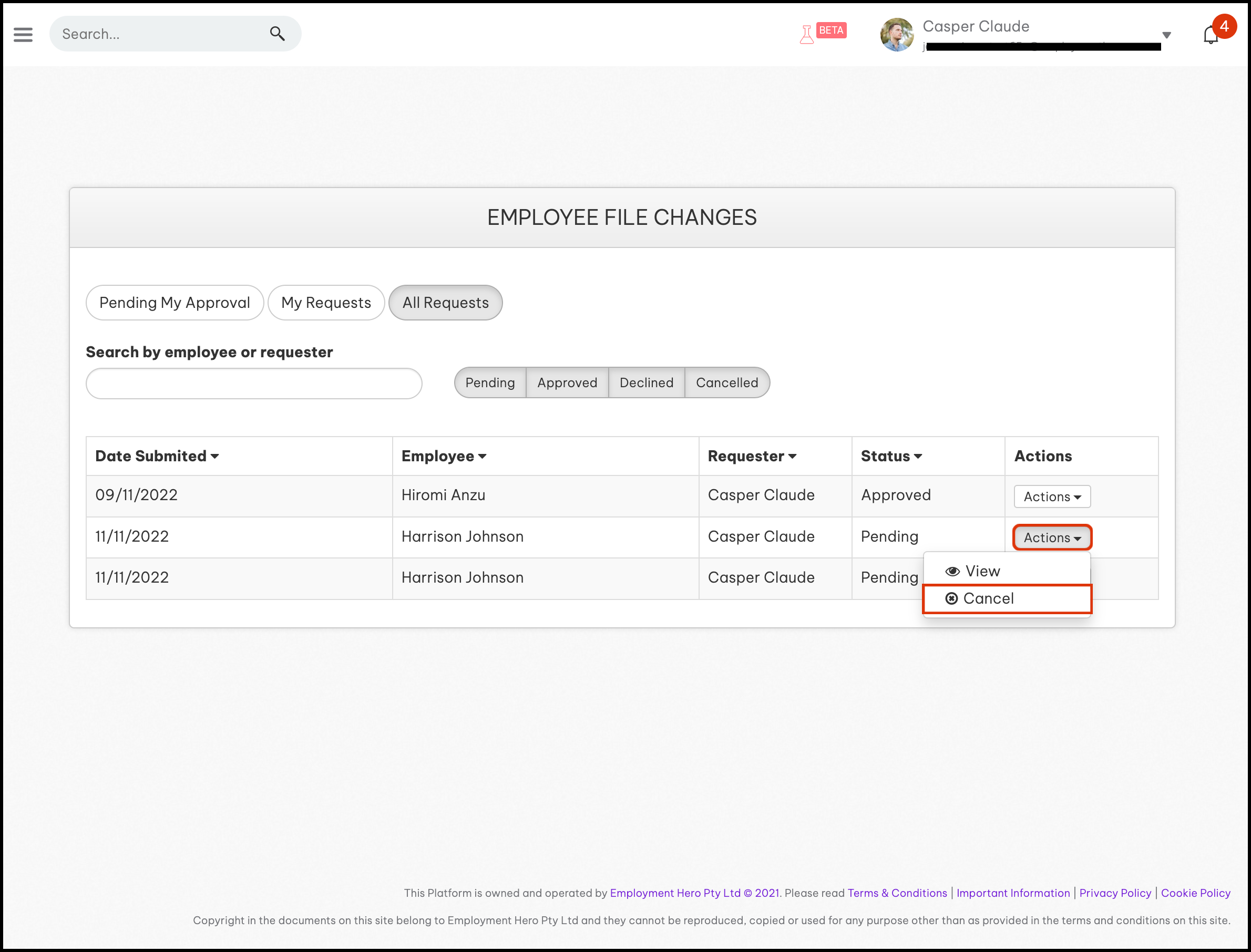 The Employee File Approvals Management feature allows you to review your organisation's employee file change requests, compare the two versions, and approve or decline the submissions. You can also use this feature to view the details of the request and cancel a submission if it is no longer needed.