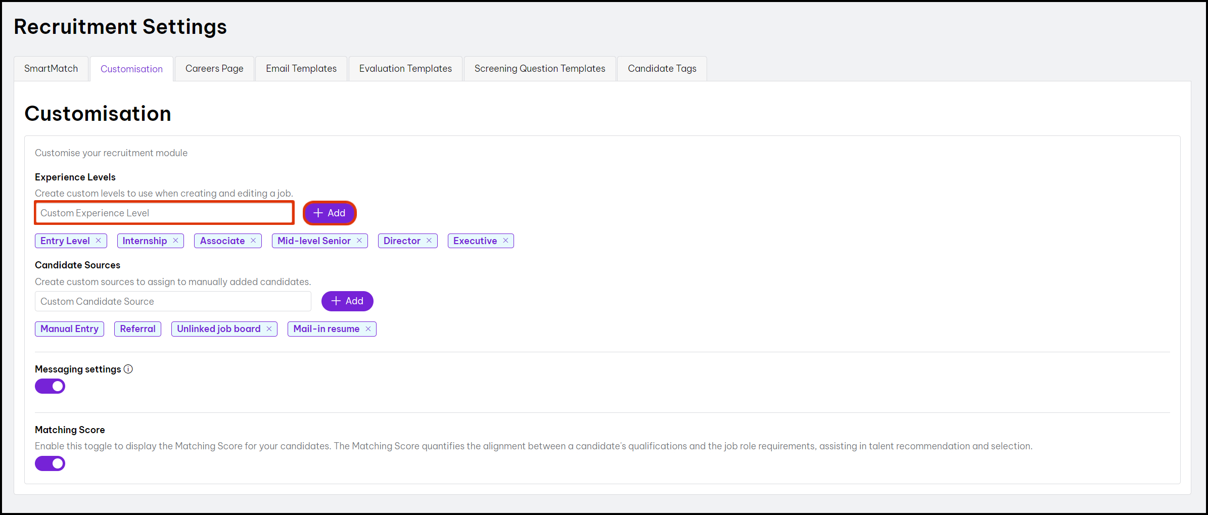 The Customization feature enables you to tailor the recruitment module to meet your organisation's specific needs. For example, you can add or remove experience levels to match job requirements, such as creating a JLPT N2 level for a Japanese translator role. Additionally, the Messaging feature allows direct communication with candidates from within the recruitment module.
