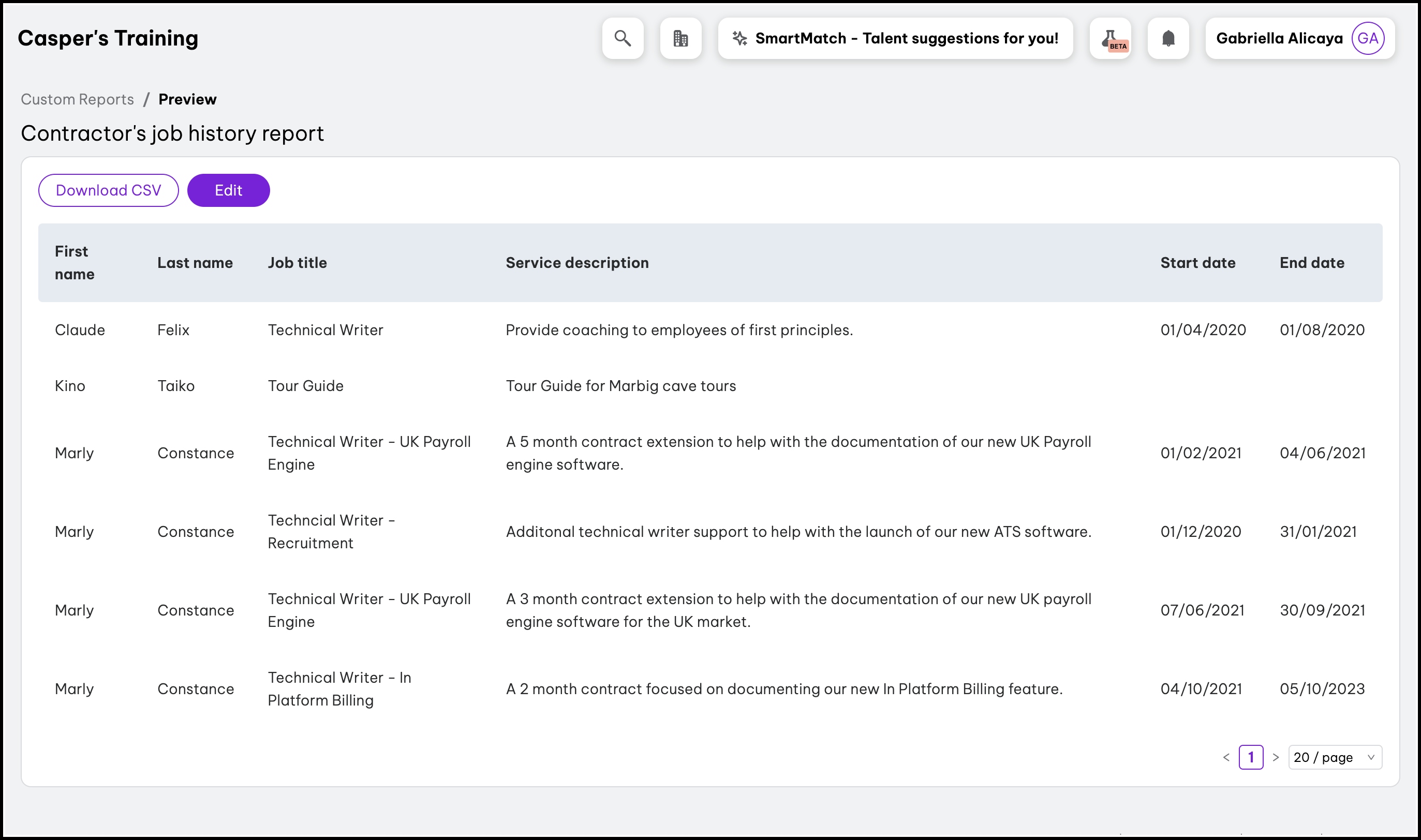 You can use the Custom Report feature to build a contractors' job history report to display your contractors' start and end dates.