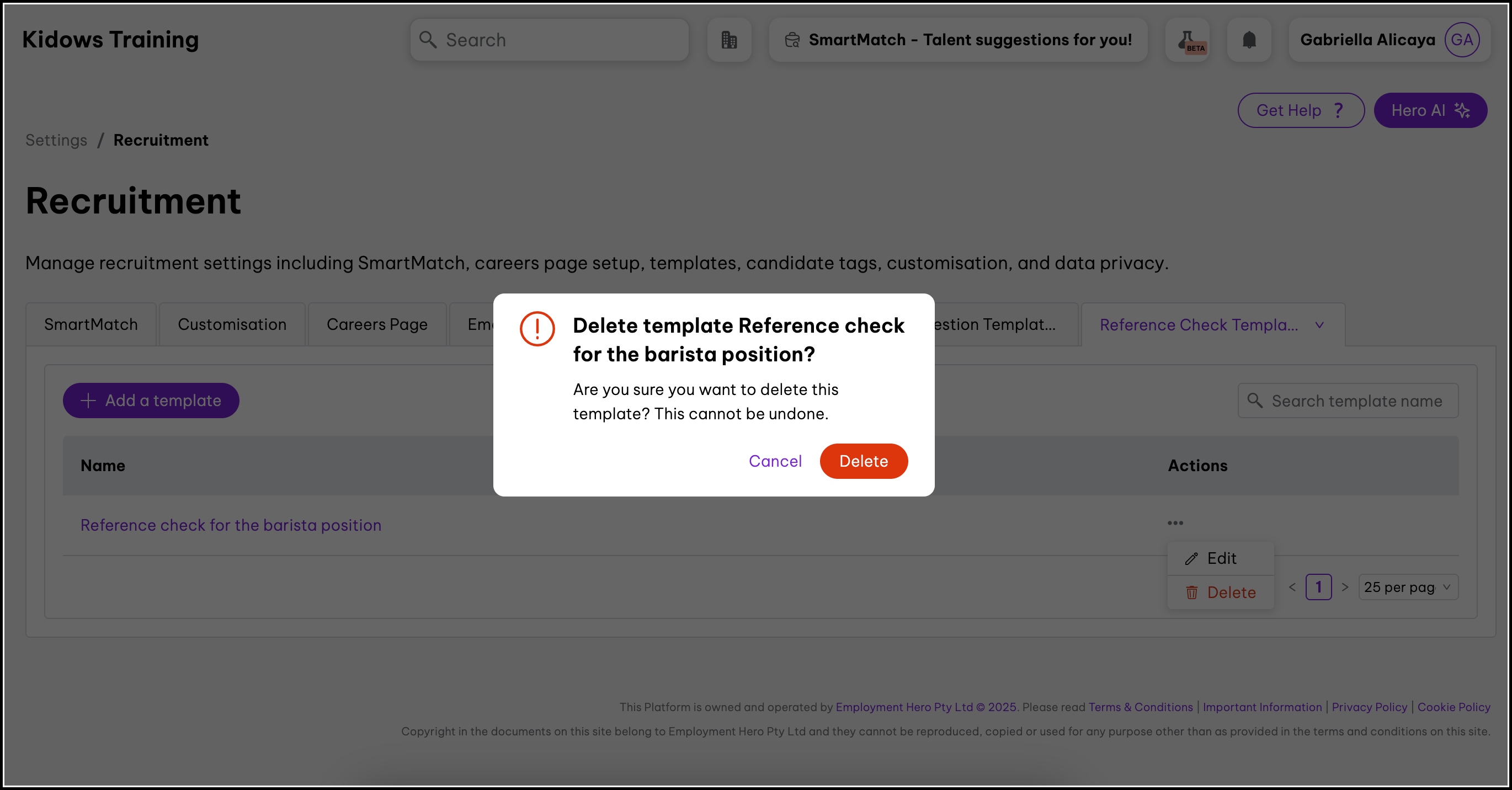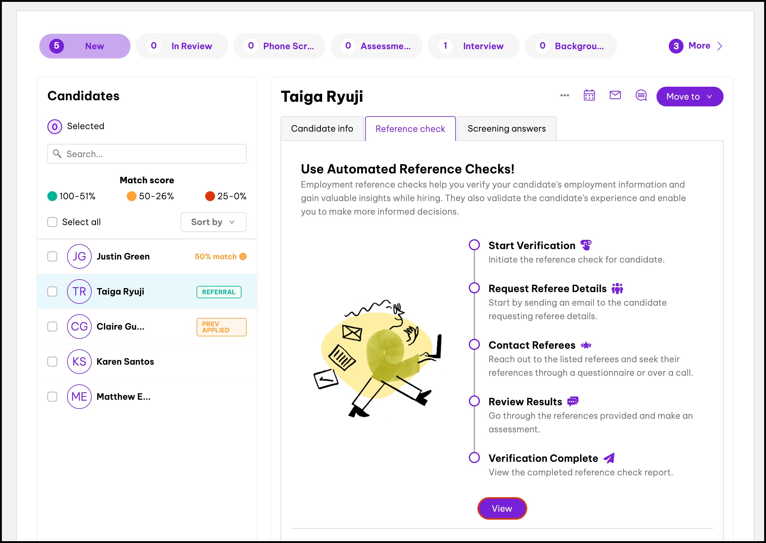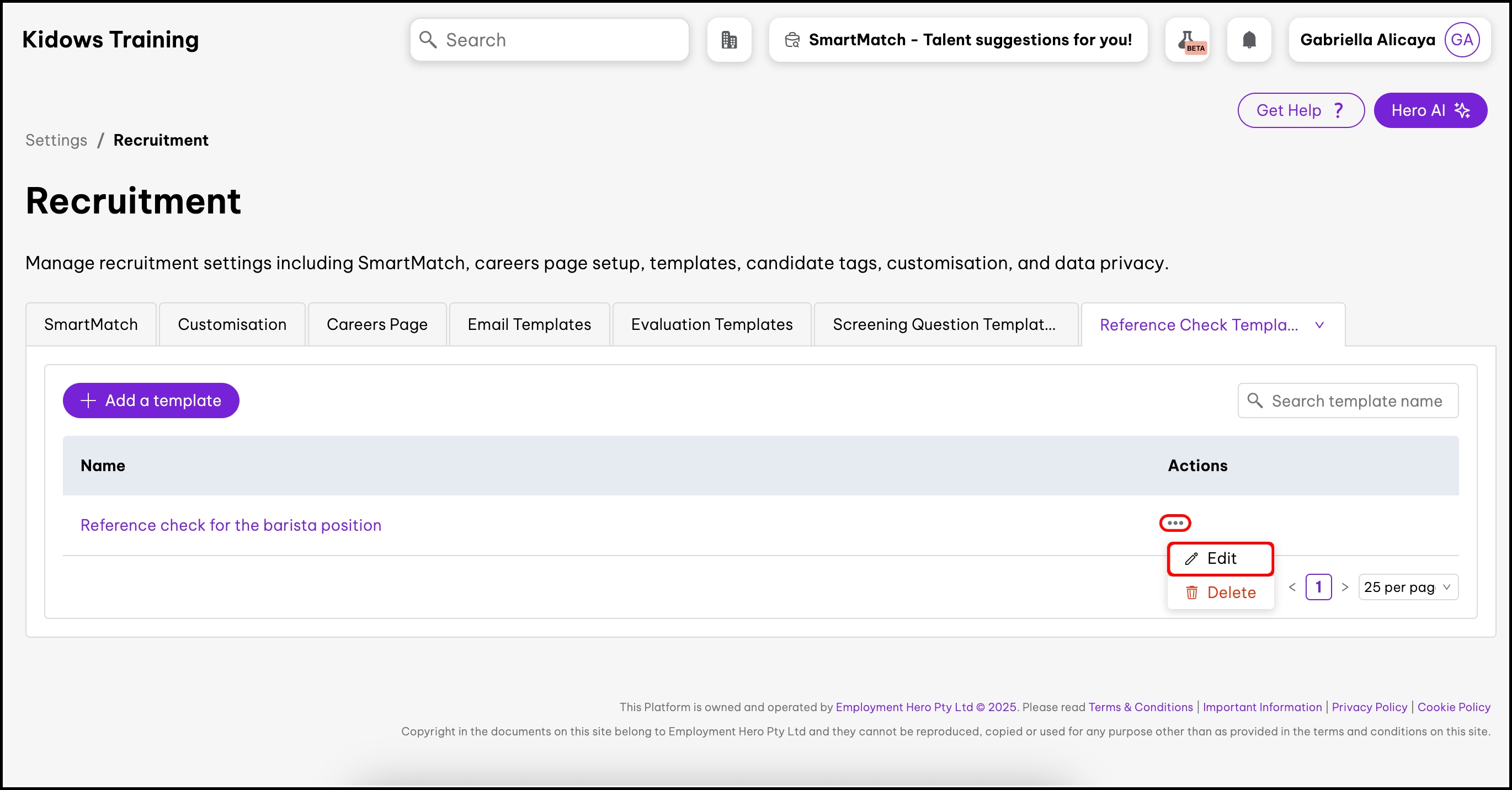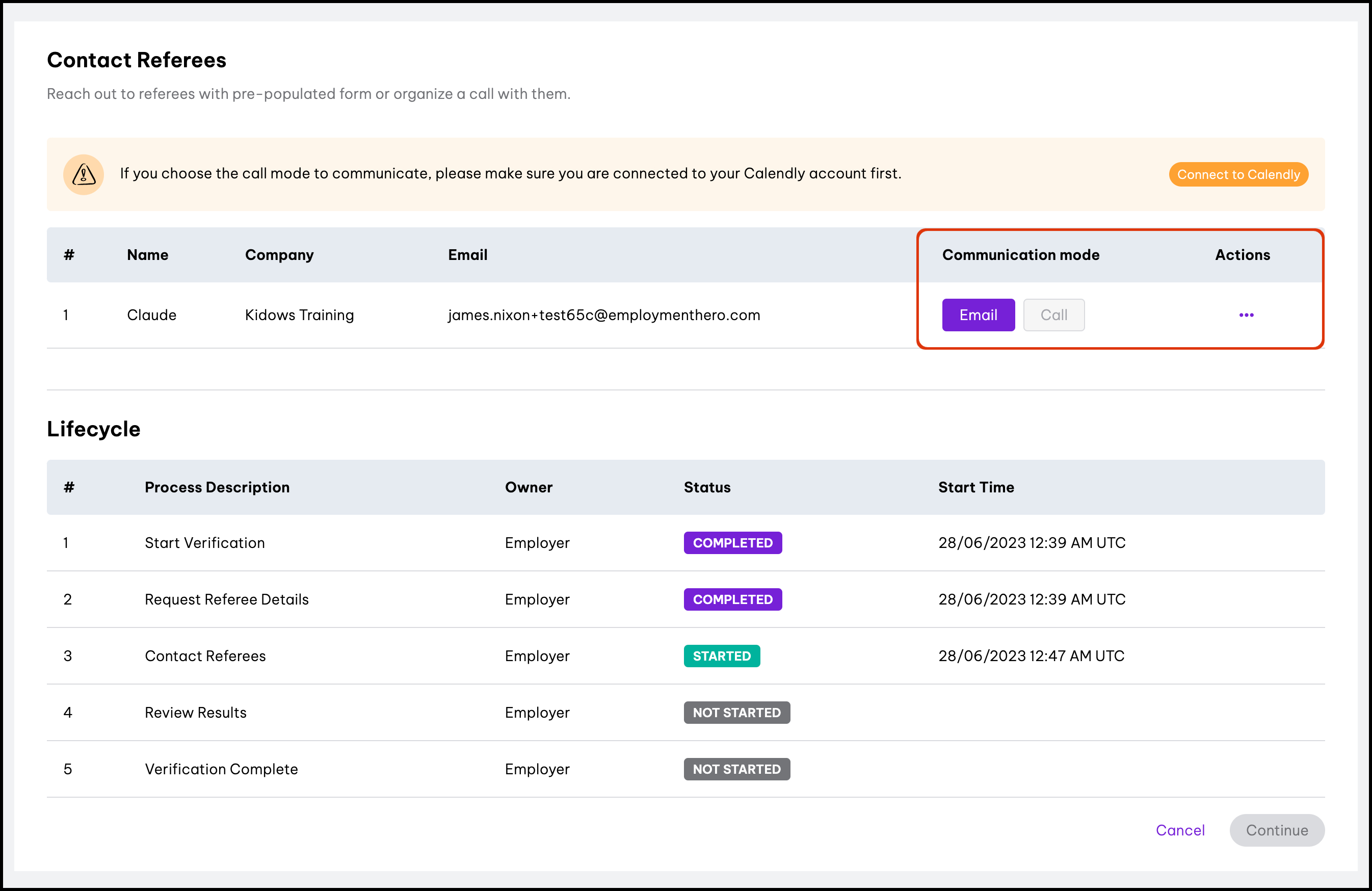 The Recruitment Management feature allows you to manage your candidate references in platform. First up you select the candidate, and how many references you need from them, then the platform will send them a link to complete these details. Lastly, you then have the choice to email and/or call these references from within the HR platform and mark how you found their input.