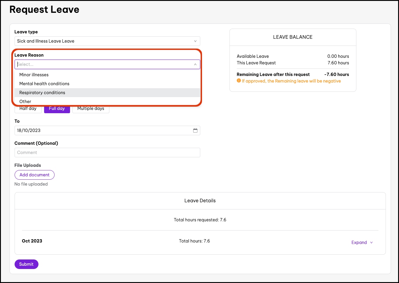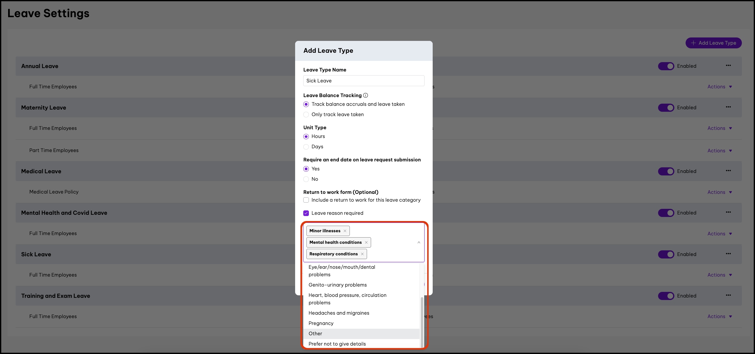 You can set up an optional toggle to record the reason for absence for an employee who has taken sick leave. This data feeds into a Sickness Report for increased leave details and forecasting. It shows the types of leave taken, and common days on which leave is taken.