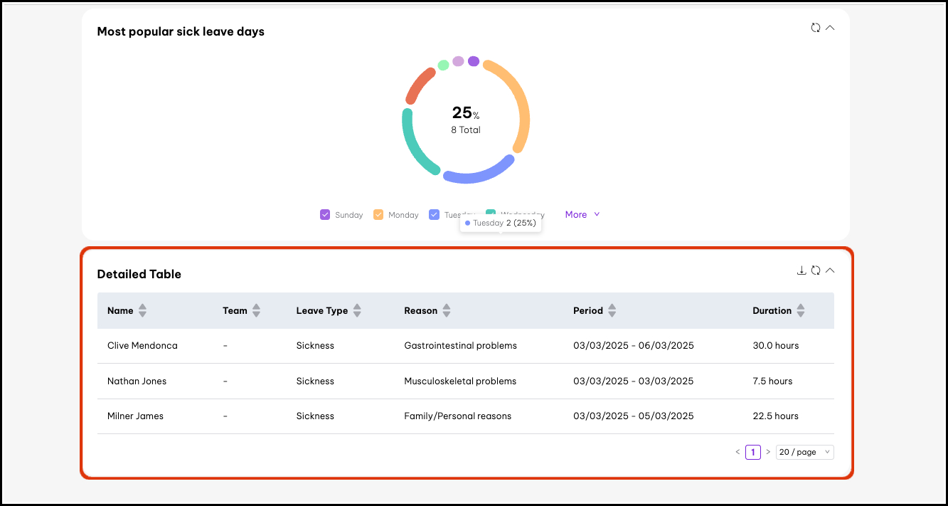 - Sick Leave by Reason: the number indicates the total number of leave requests made during selected period.
