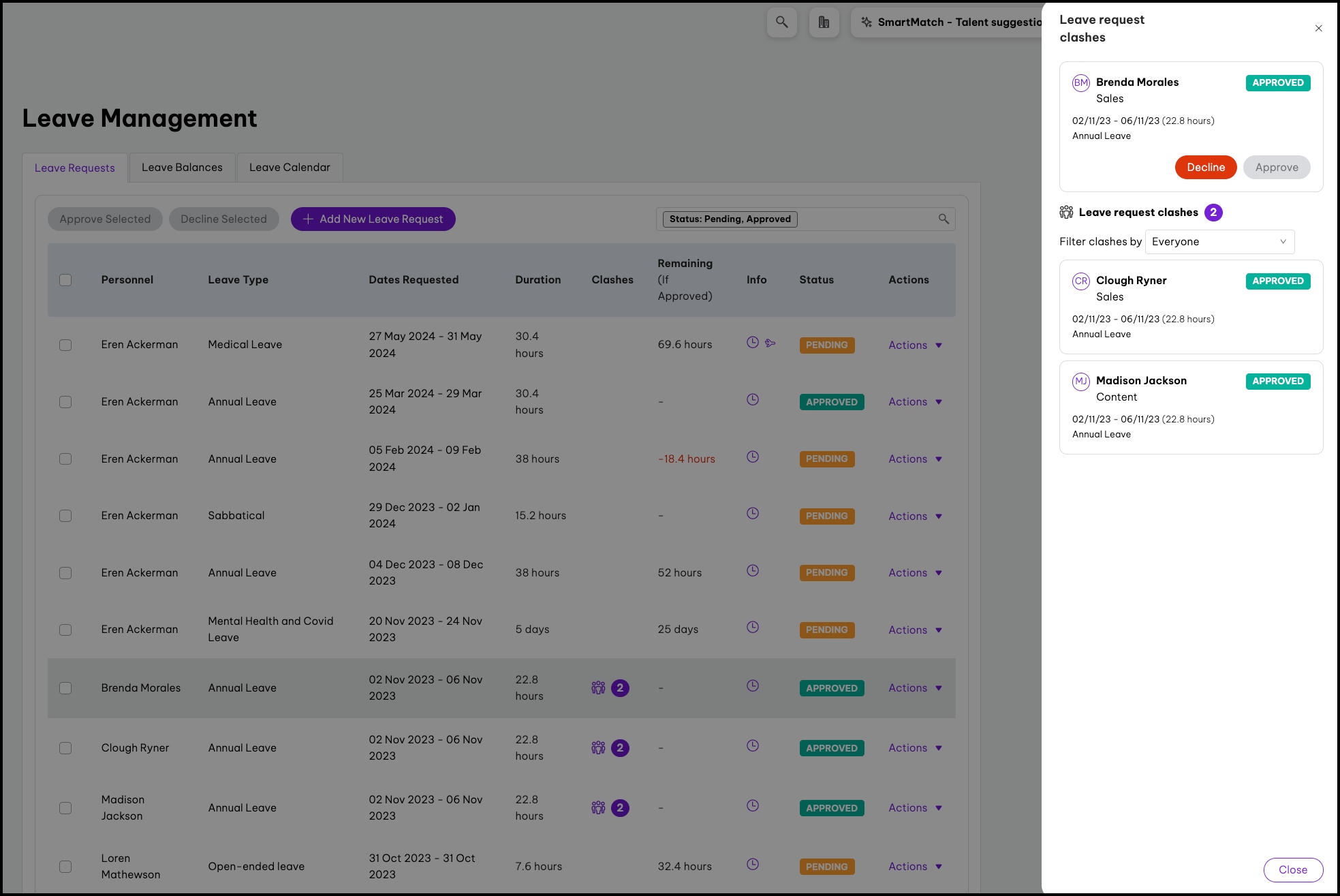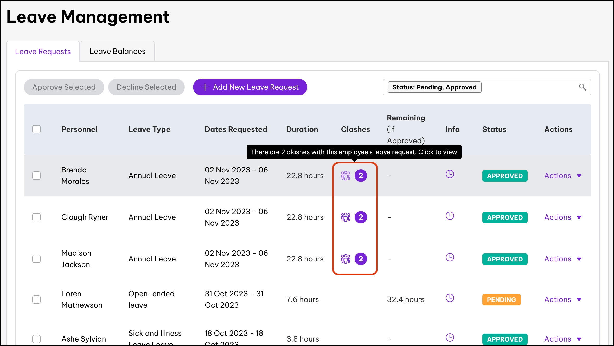 - Select a leave request clash in the Clashes column.
