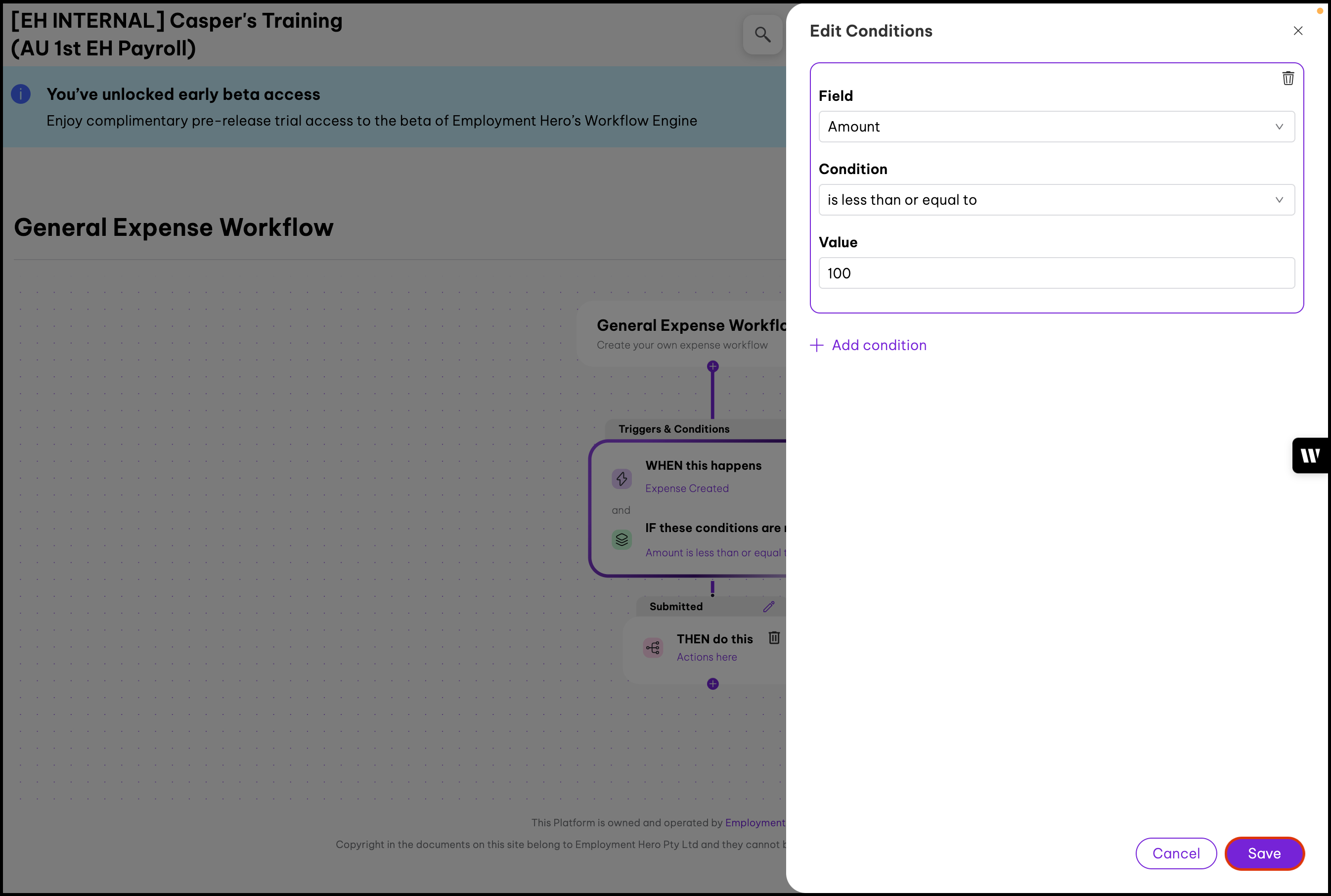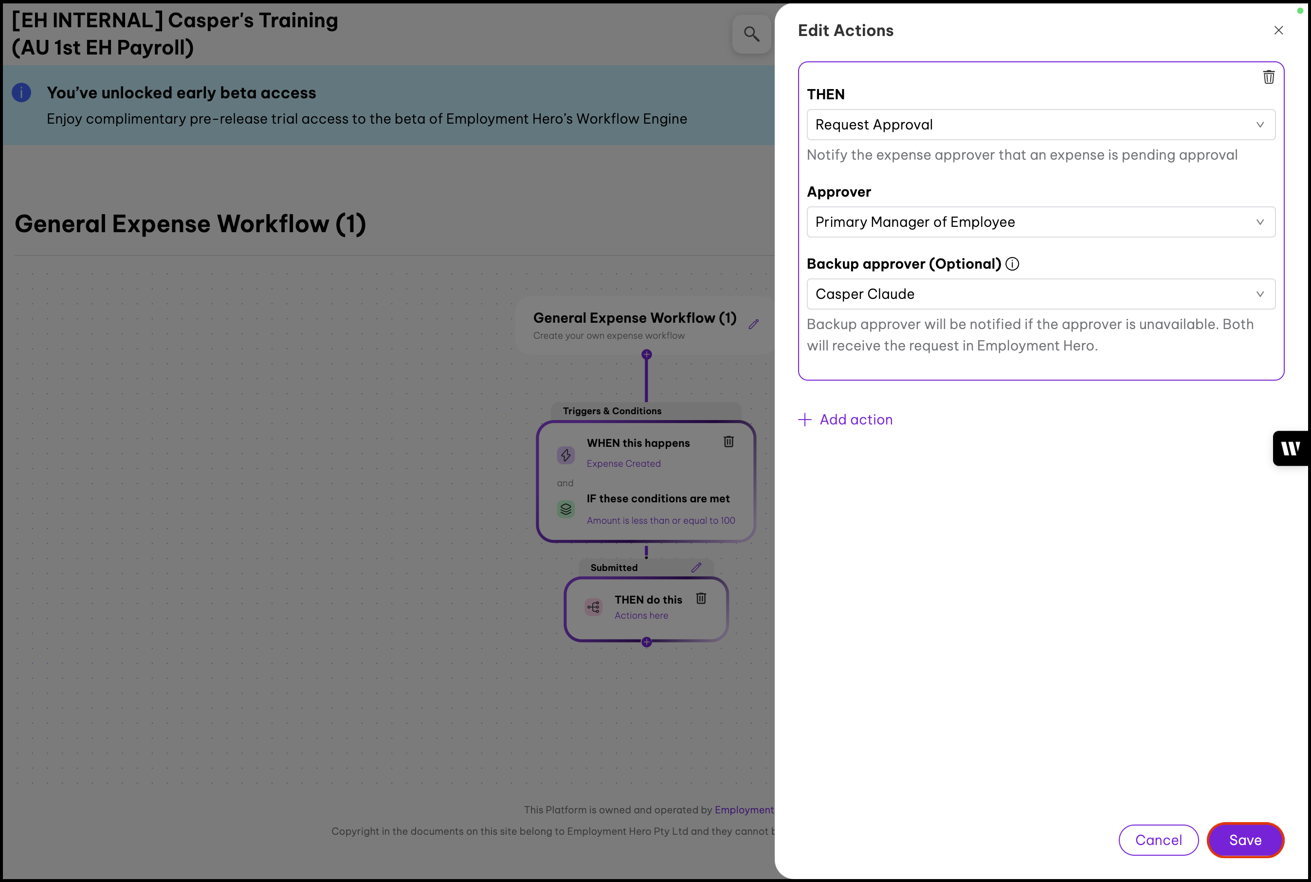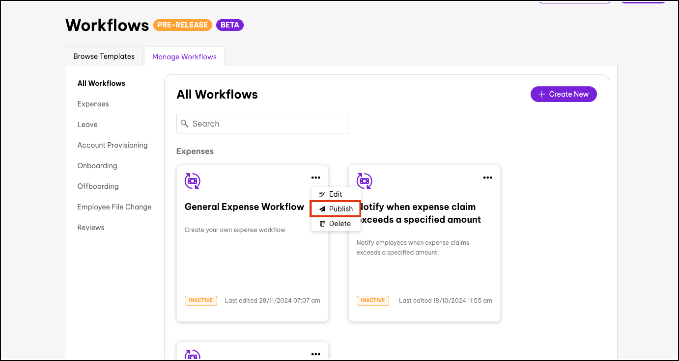 This feature allows you to customise expense approvals to suit your organisation's needs. By unpublishing the default workflow, you can then create your own expense workflow that aligns with your approval hierarchies.