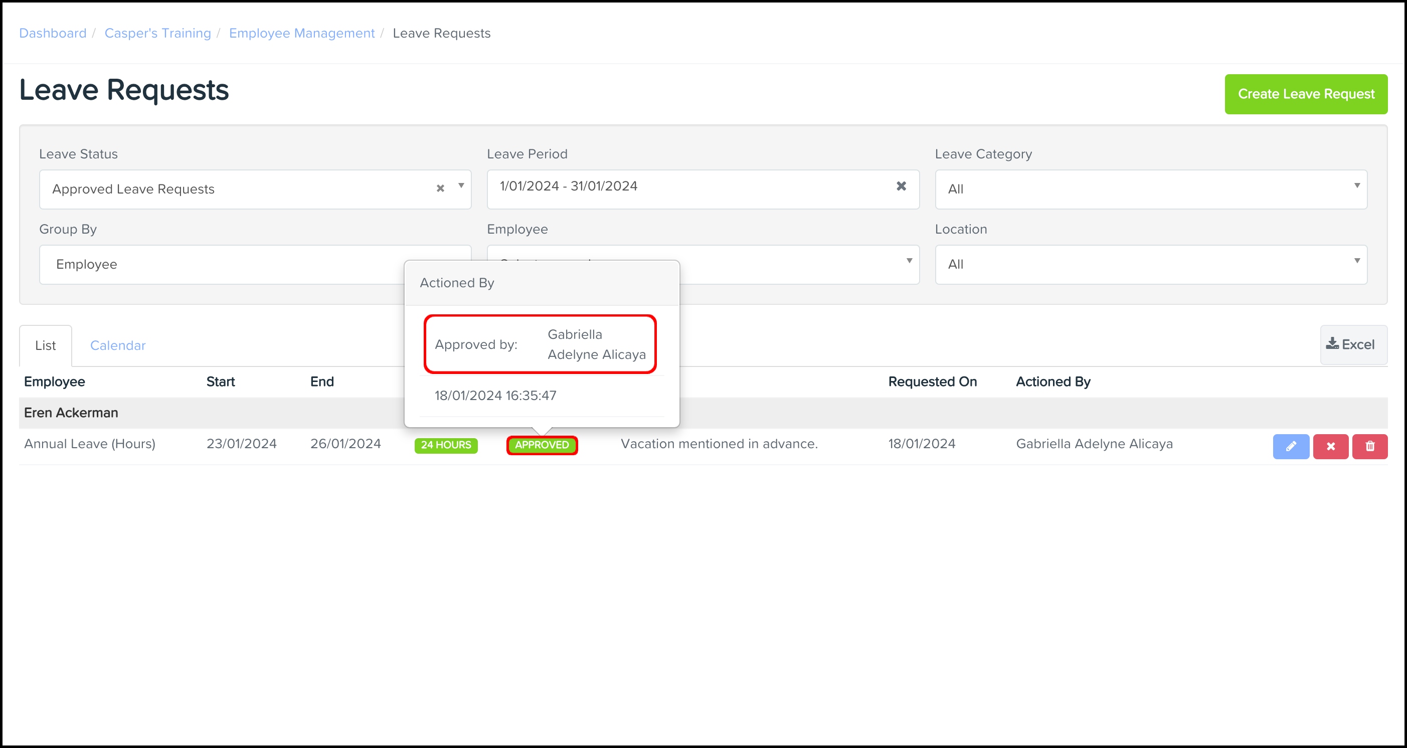 In the image below, the leave request is for employee Eren Ackerman. Admin Gabriella Adelyne Alicaya approved the request directly on the Payroll classic platform.