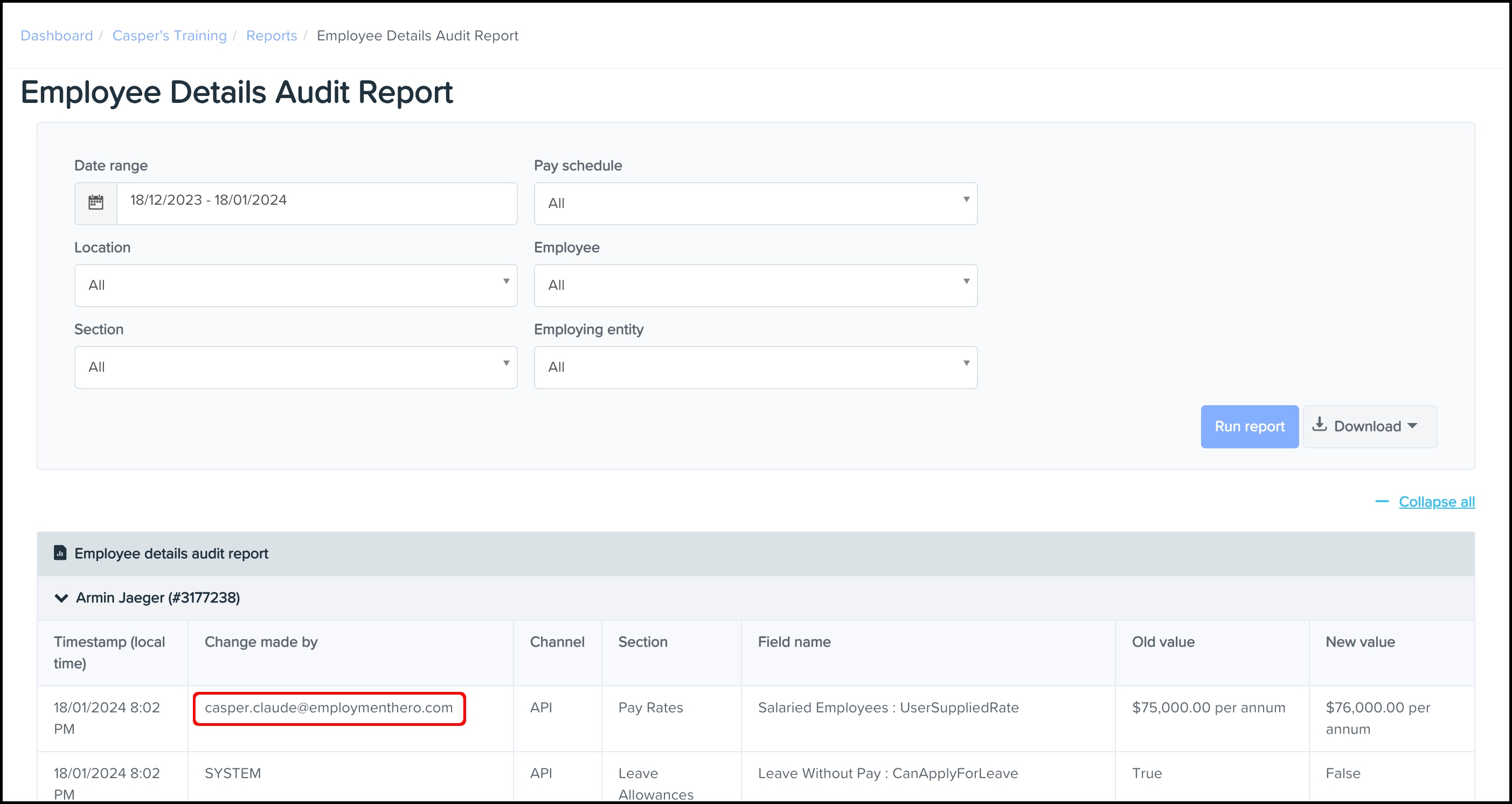 But on the Payroll classic platform, the "Change made by" field will display the email of the person who made the integration. You will see here the email address of Casper Claude, the person who completed the integration for this organisation.