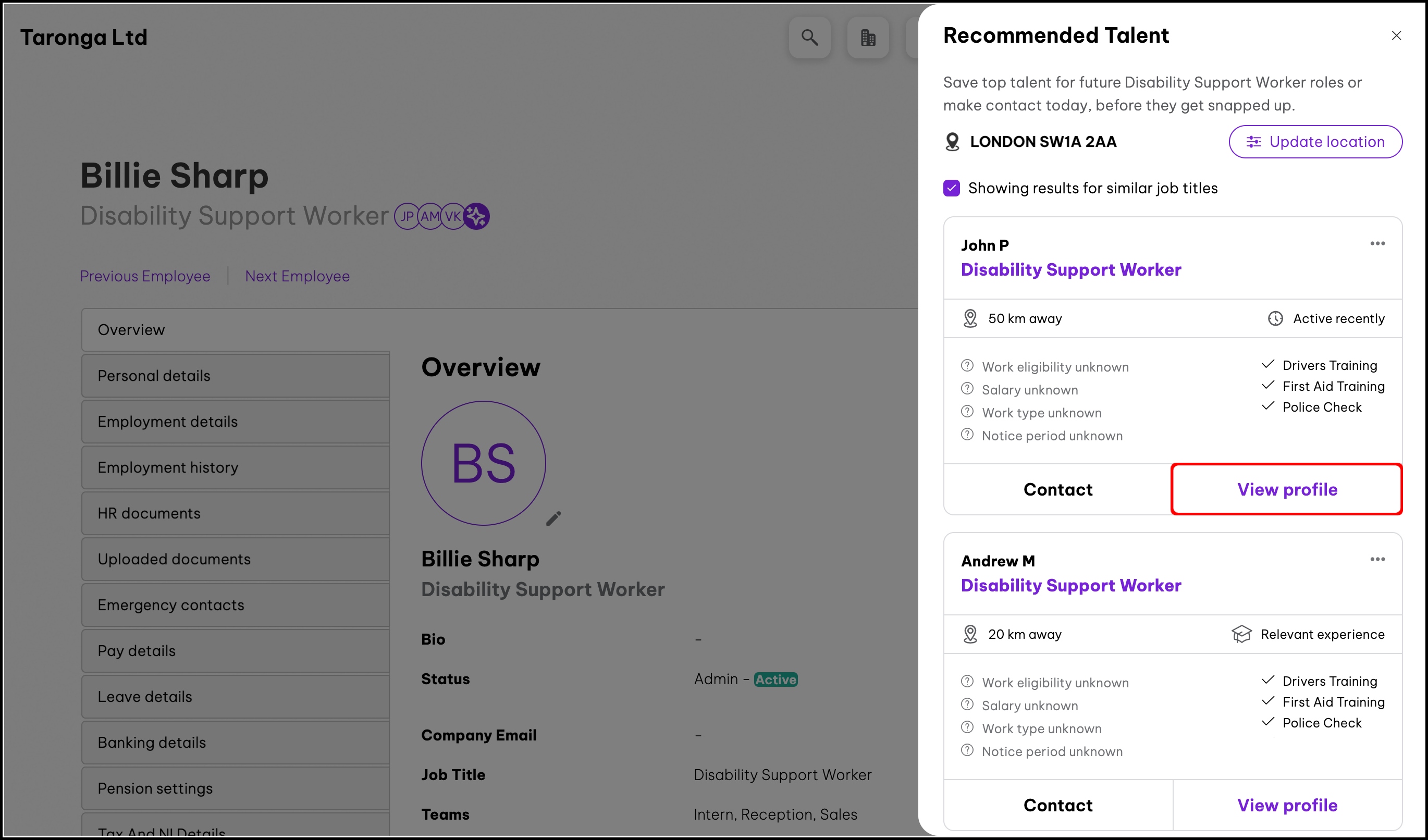 The employee file screen allows you to view details about your employees and their roles. You can use SmartMatch to find suitable candidates for specific roles, such as a product engineer. From the employee file, you can view, save, email, and mark potential candidates as unsuitable for the role. For People Managers and Hiring Managers, please refer to this article to learn more about your user access; SmartMatch questions answered