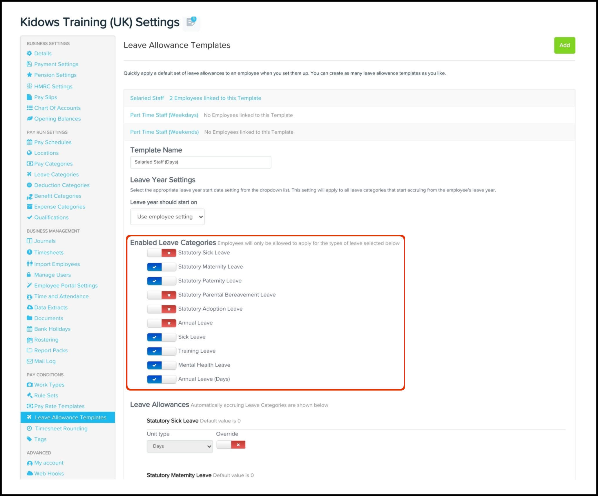 Once you have created your leave categories, you will need to create your leave allowance templates. These allow you to group multiple leave categories together and set the rate at which each leave type accrues leave in days or weeks. There is no limit to the amount of templates that you can create; this is because the platform allows you to assign templates per employee. The steps on how to undertake this are:
