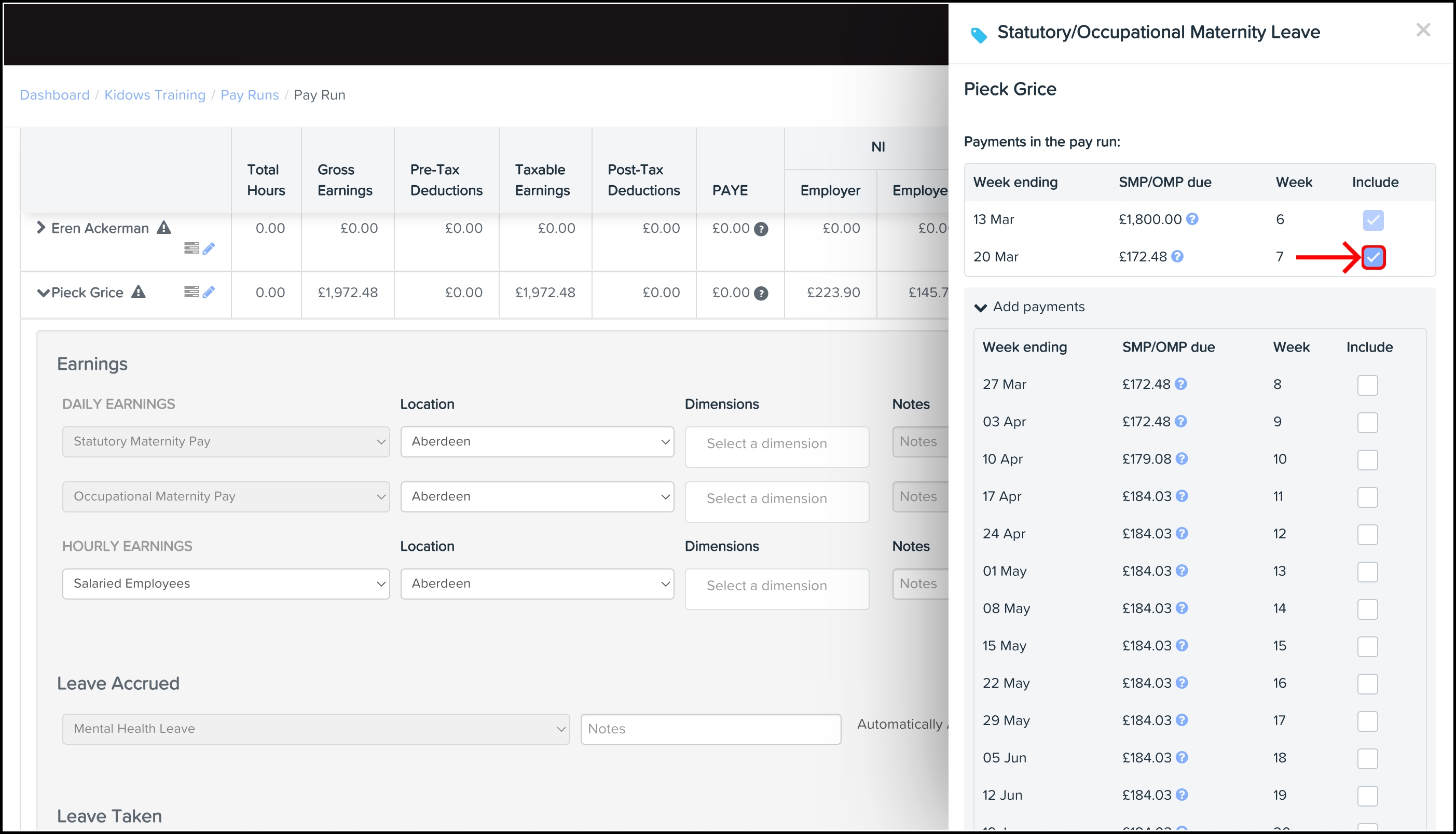 - To remove weeks of maternity pay, untick the unneeded weeks.