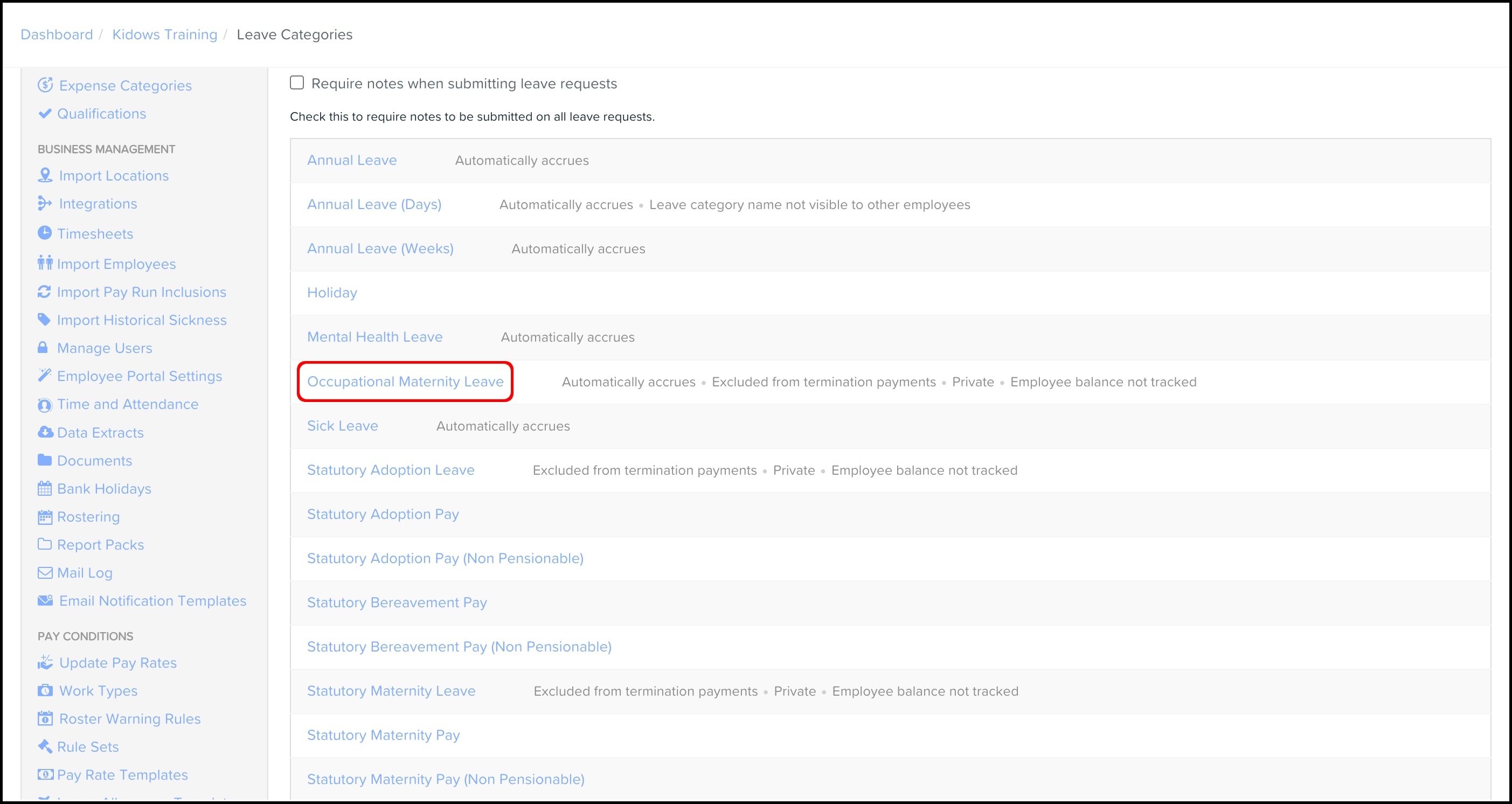 - Leave category - Select the OML category you created in the Leave Categories page.