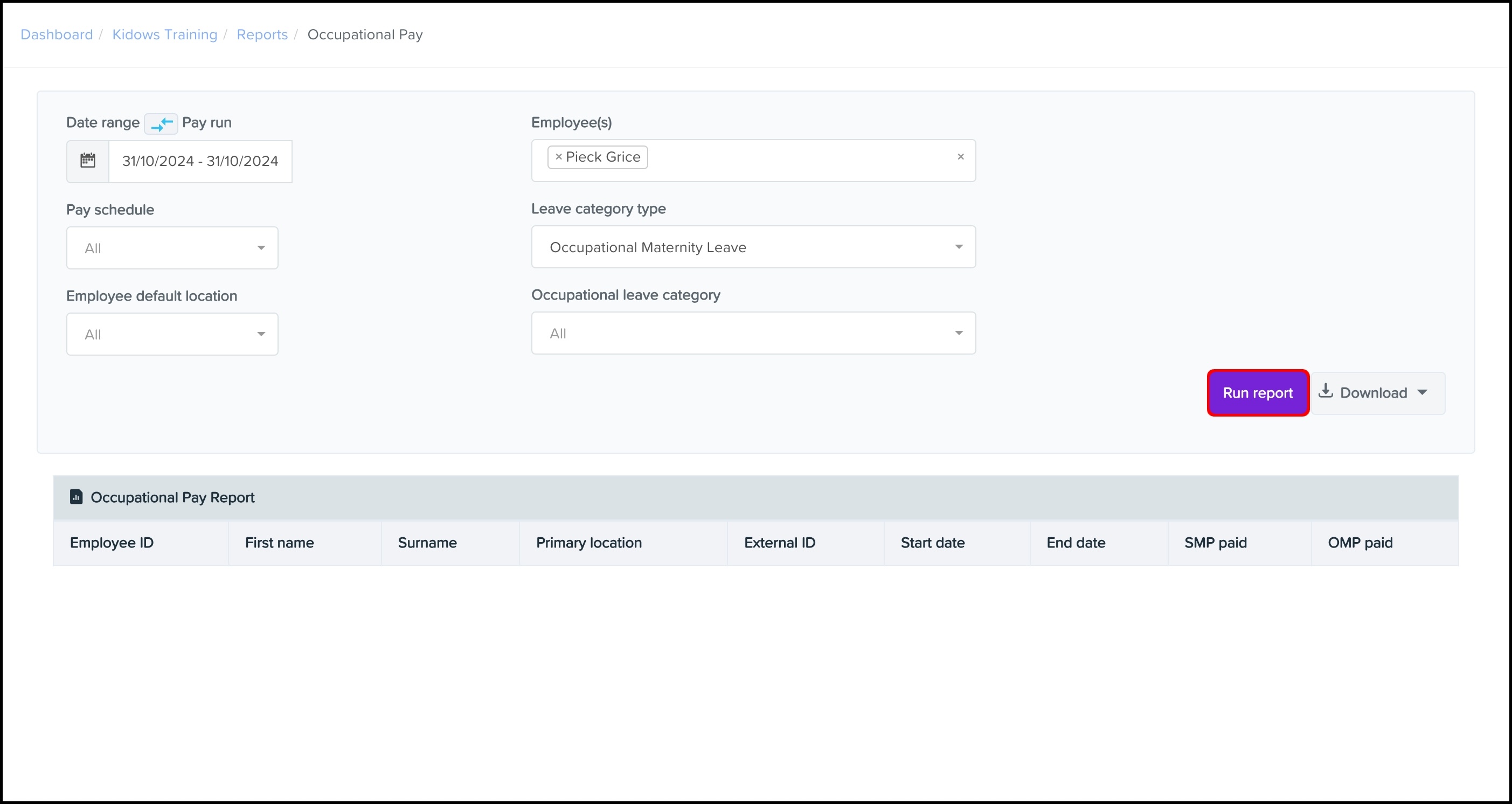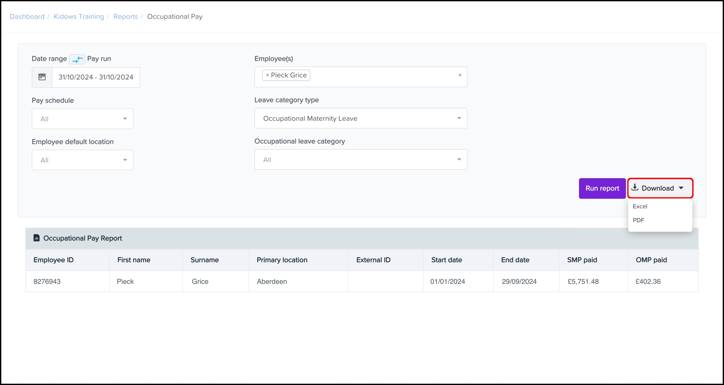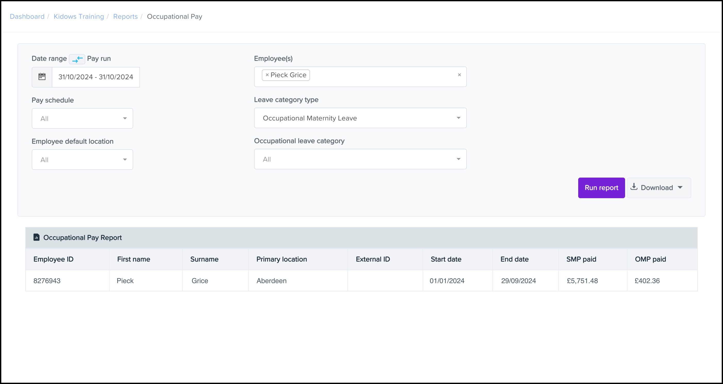 You will now see the details of the Occupational Maternity Pay report.