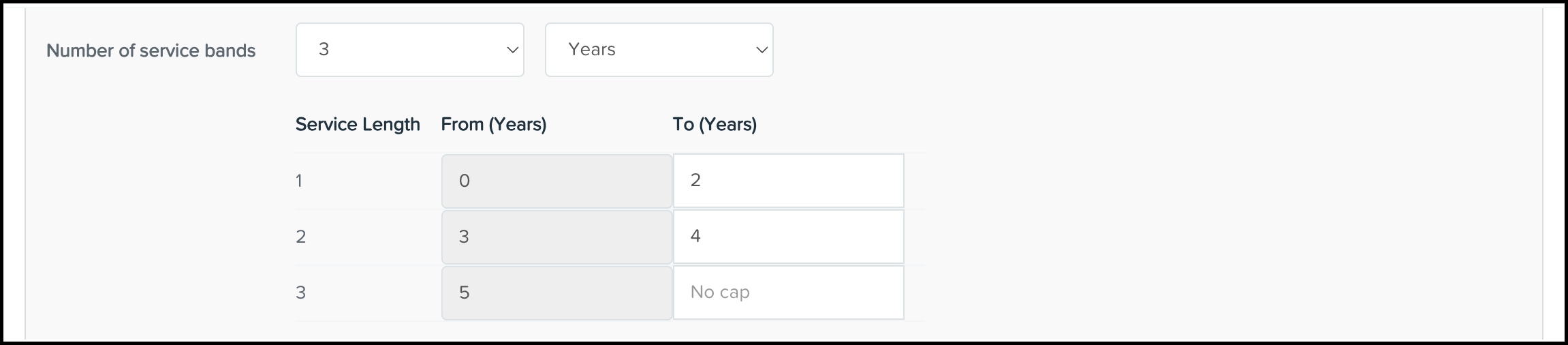 - Service band 3 is for employees who have been with the business for 5 or more years. Note that there is no cap for the last service band.