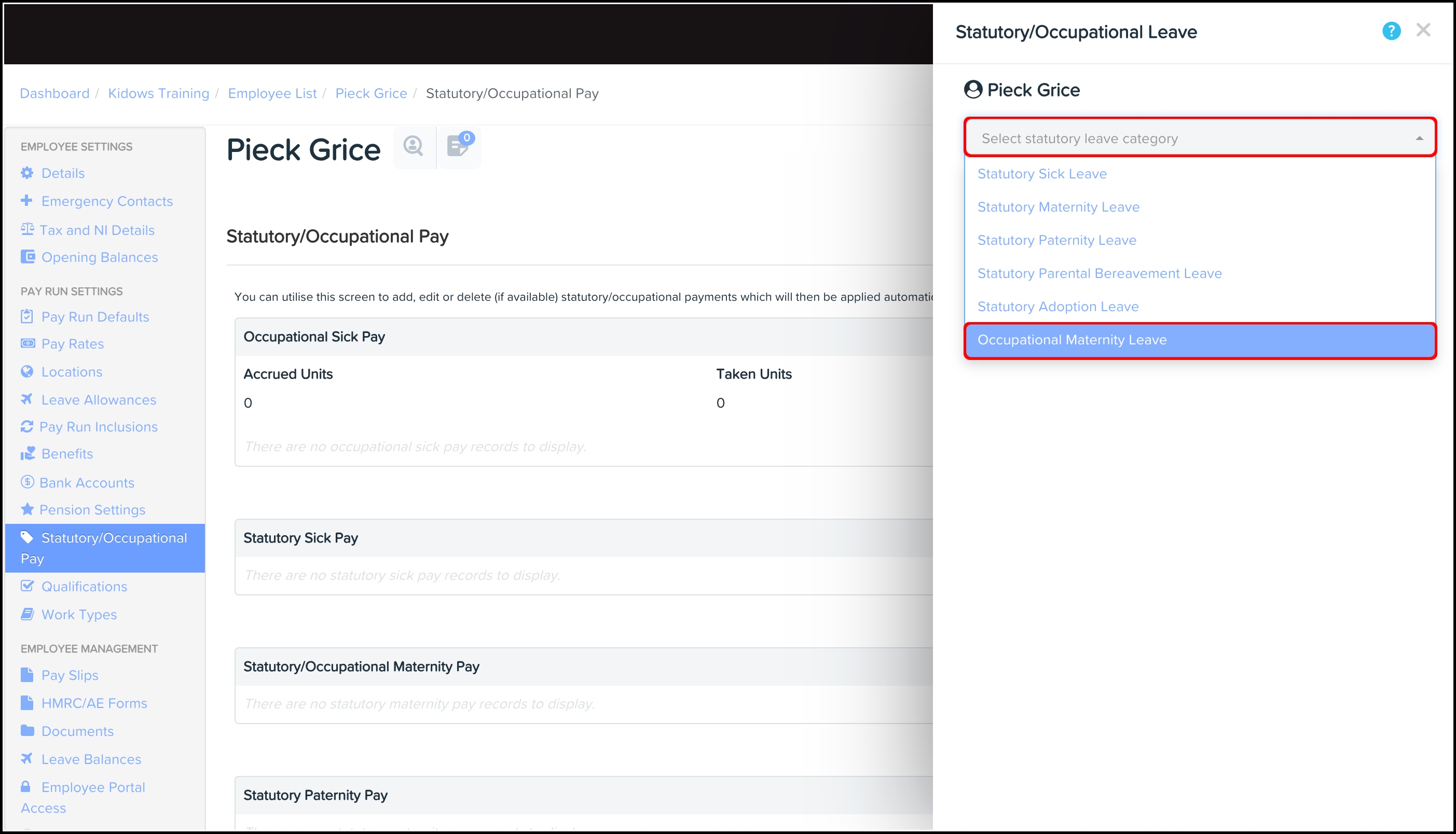 - Select Occupational Maternity Leave.