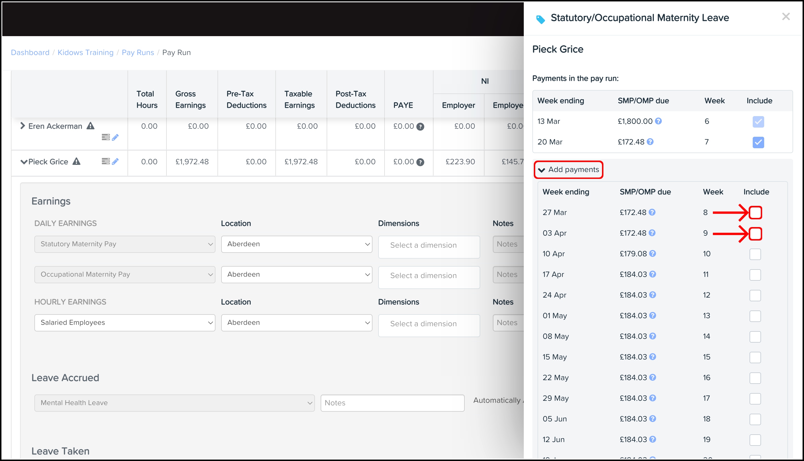 - Weeks payable and Weeks already paid can be used if you have changed software part-way through a maternity leave to make sure only the weeks left are paid.