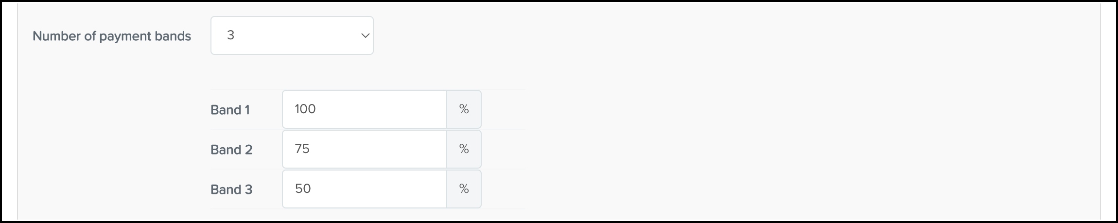 Next, you can choose the number of payment bands and what percentage each band should be paid at. In this example: band 1 is at 100%, 2 is at 75%, and 3 is at 50%.