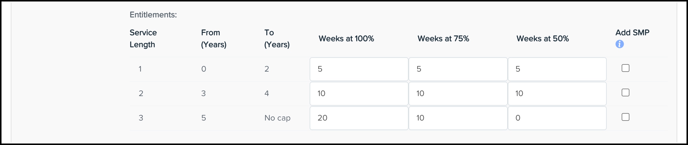 Once complete, the platform will open the Entitlements section. There will be a table for you to enter the number of weeks payable at which band for each service length.