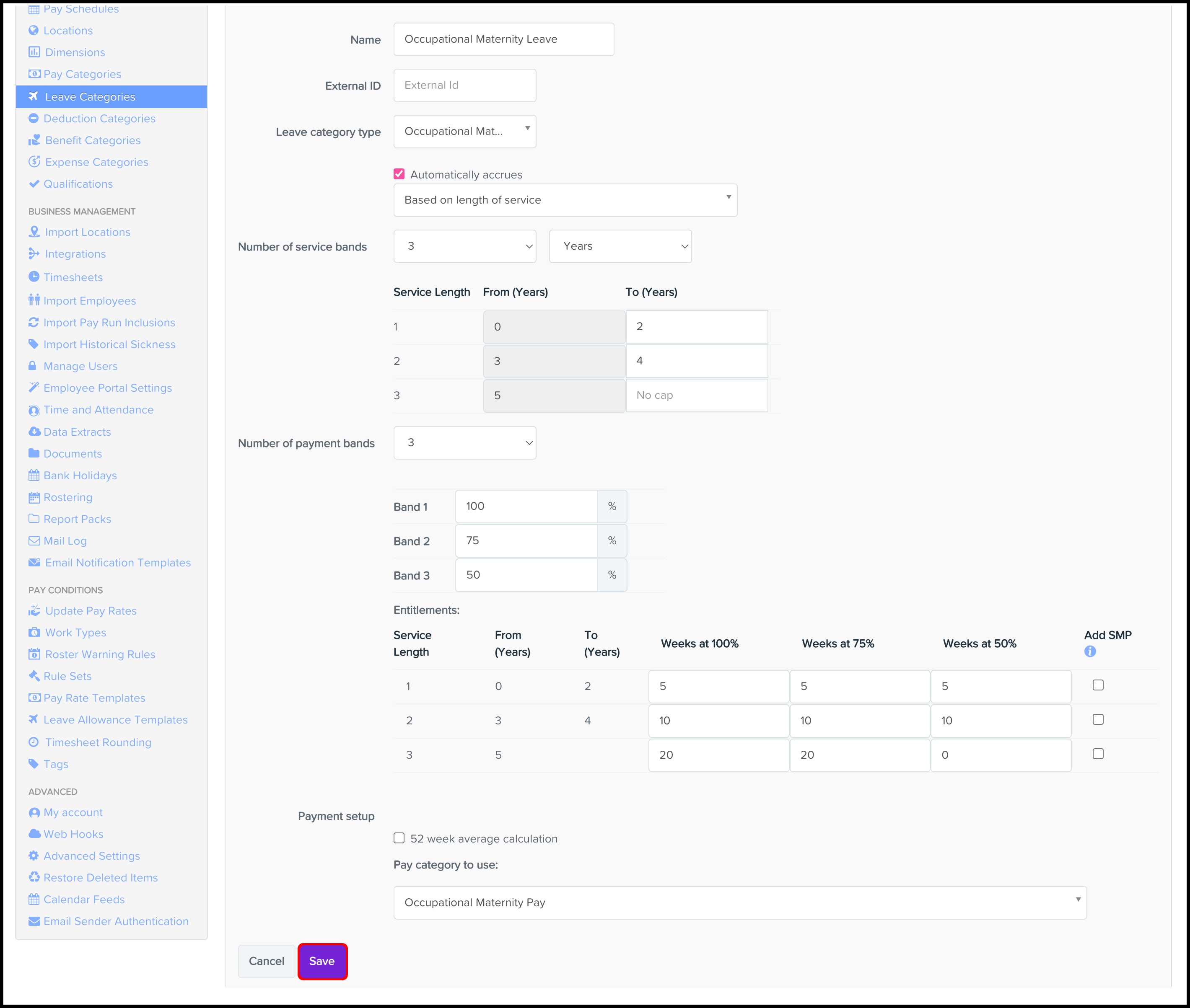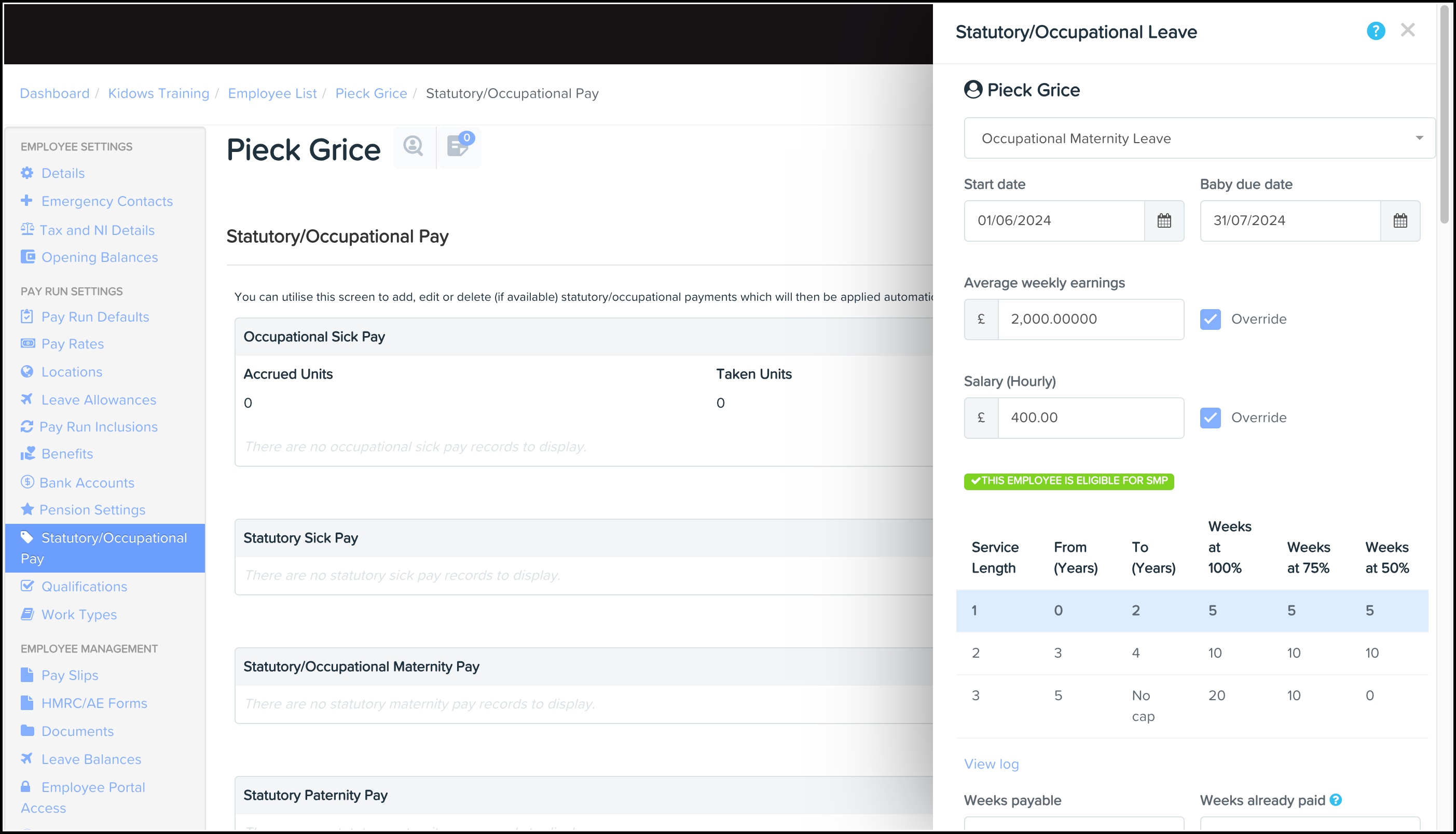 Occupational maternity leave (OML) within the leave category settings will allow you to set up OML categories using service length-based entitlement and up to 10 payment bands. Adding this to the employee within their Statutory/Occupational Pay section will include occupational maternity pay (OMP) alongside statutory maternity pay (SMP) in the pay run.