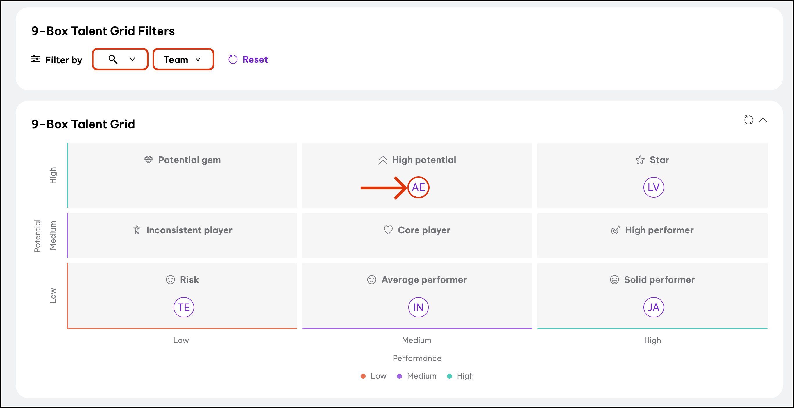 - You can filter or search for a team or individual using the filters above the 9-Box Talent Grid.