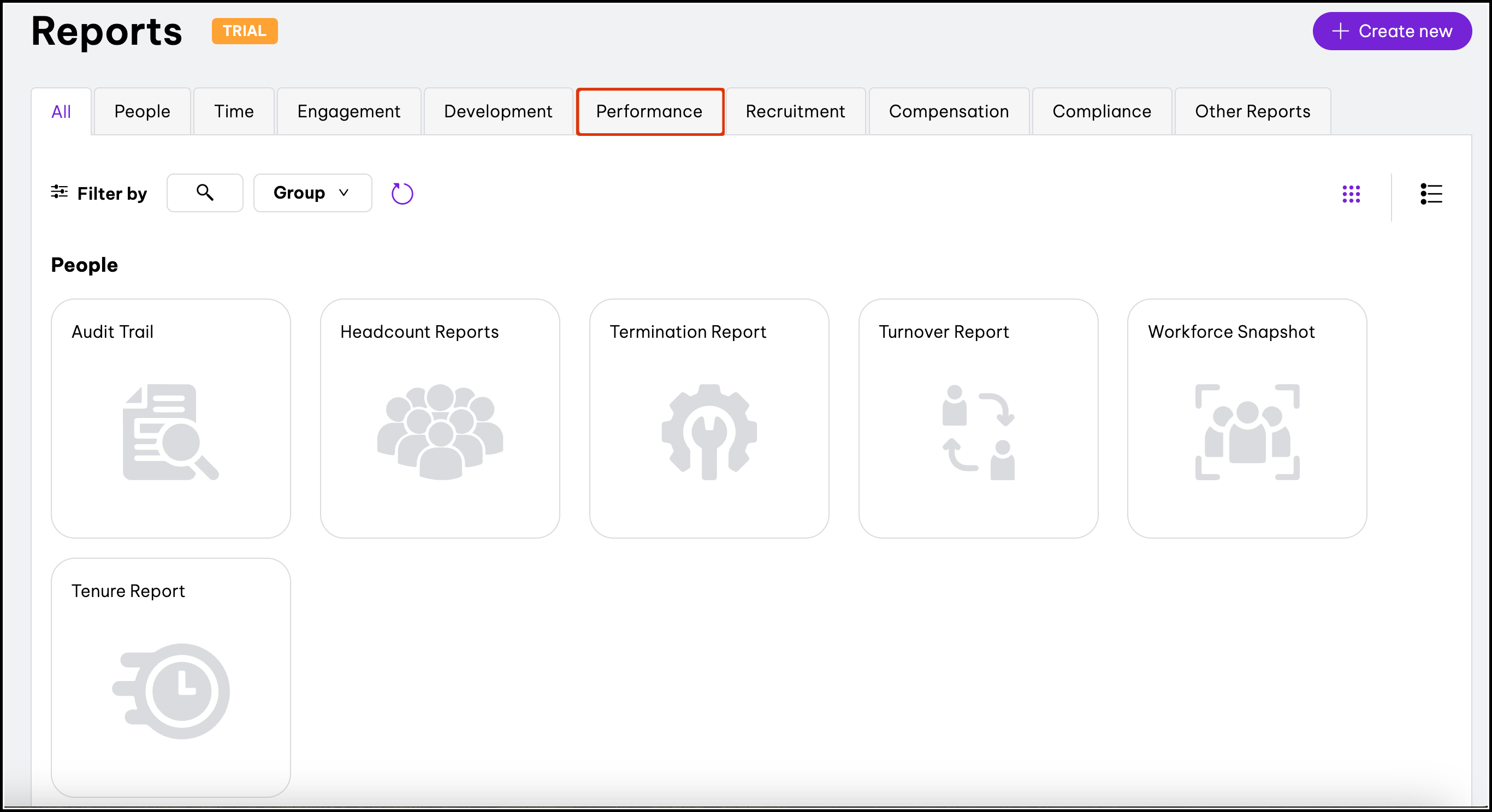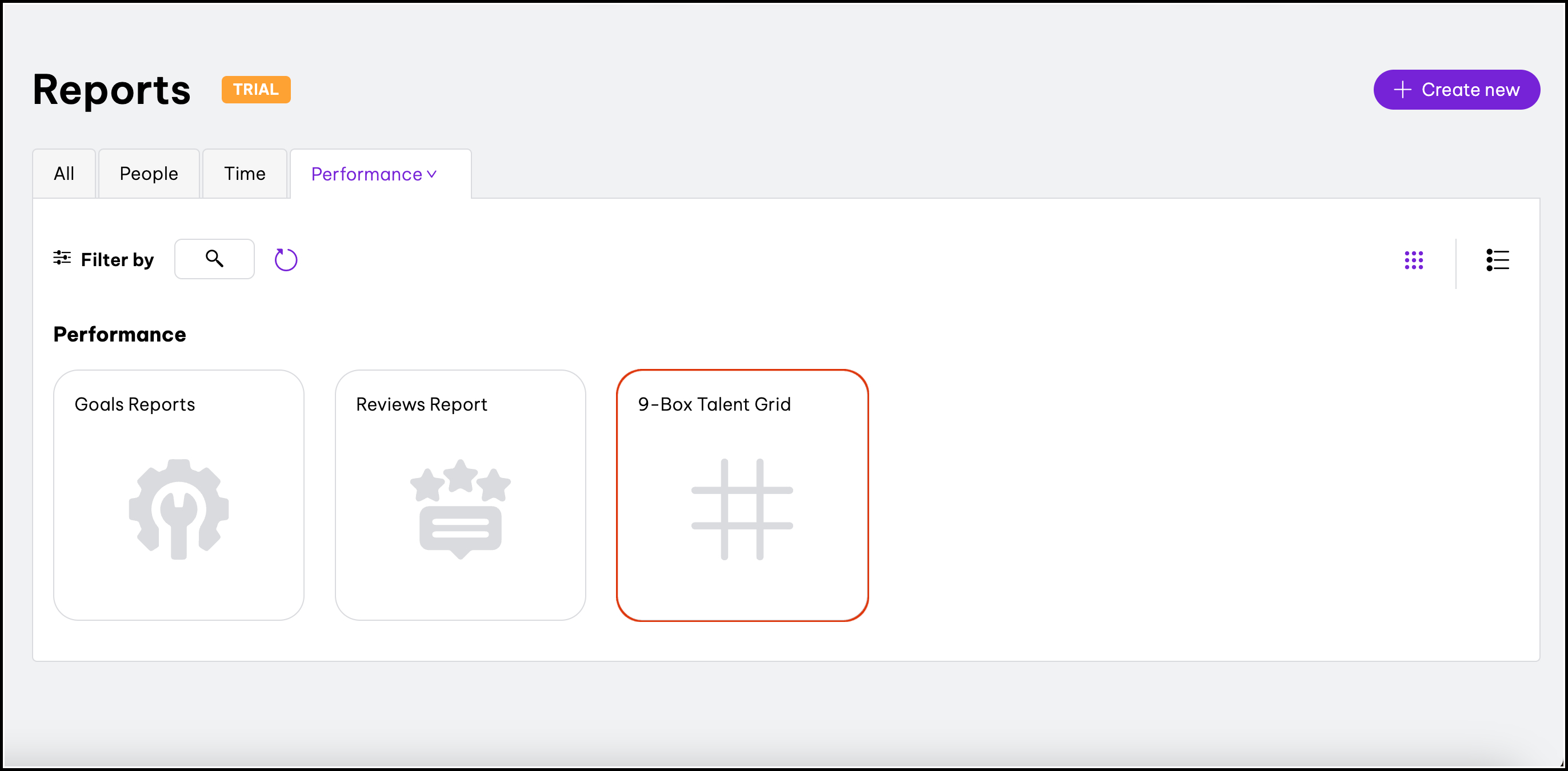 Use the 9-Box Talent Grid Report feature to assess and categorise employees based on their performance and potential. It consists of a 3x3 grid, with one axis representing performance and the other, potential.