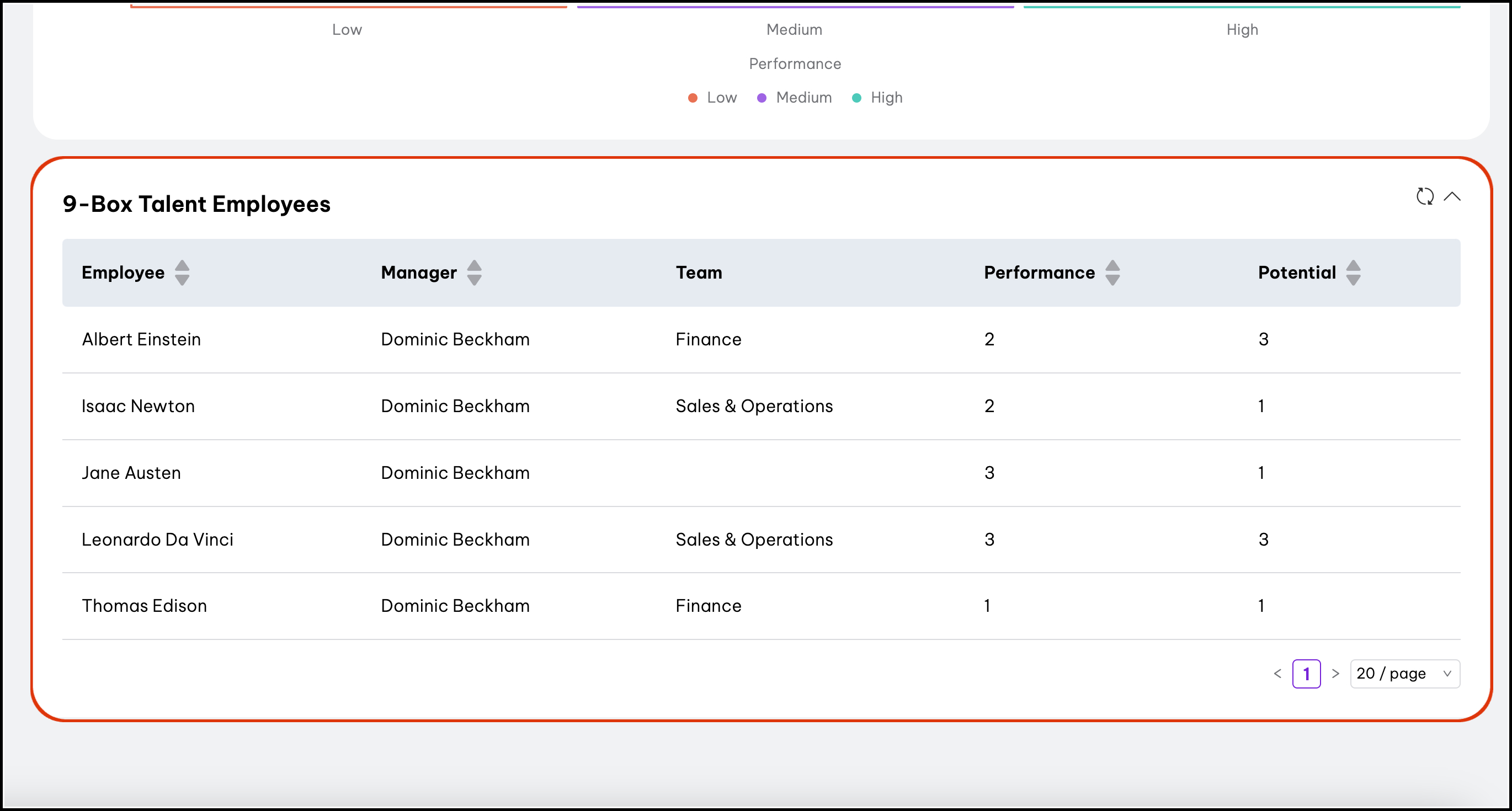 Scroll to the bottom of the page to view employees and their potential and performance ratings.