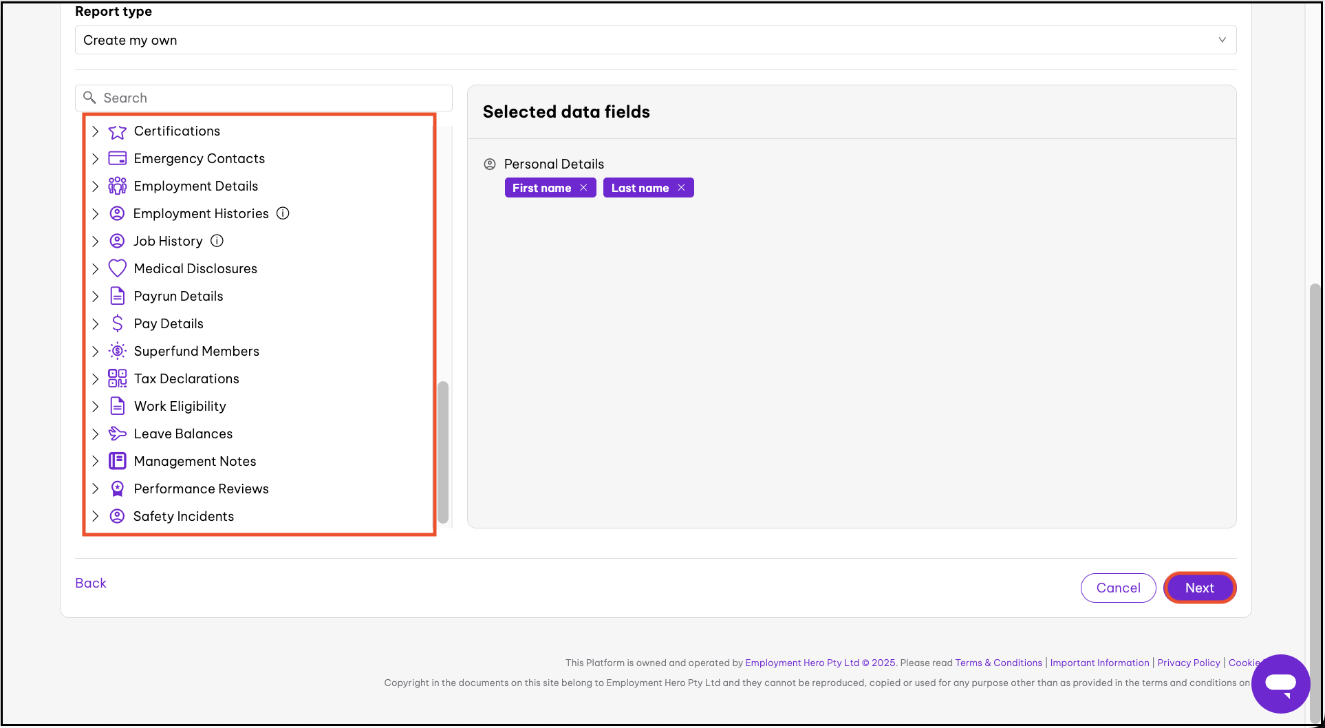 If your report contains fields with historical records, you may find it presents duplicate entries. To avoid this, tick the Exclude history checkbox (it is to the right of the Exclude terminated employees checkbox). The Exclude history checkbox will be greyed out unless your report has fields with historical records (i.e. 'Benefits', 'Employment History', and 'Pay Details').