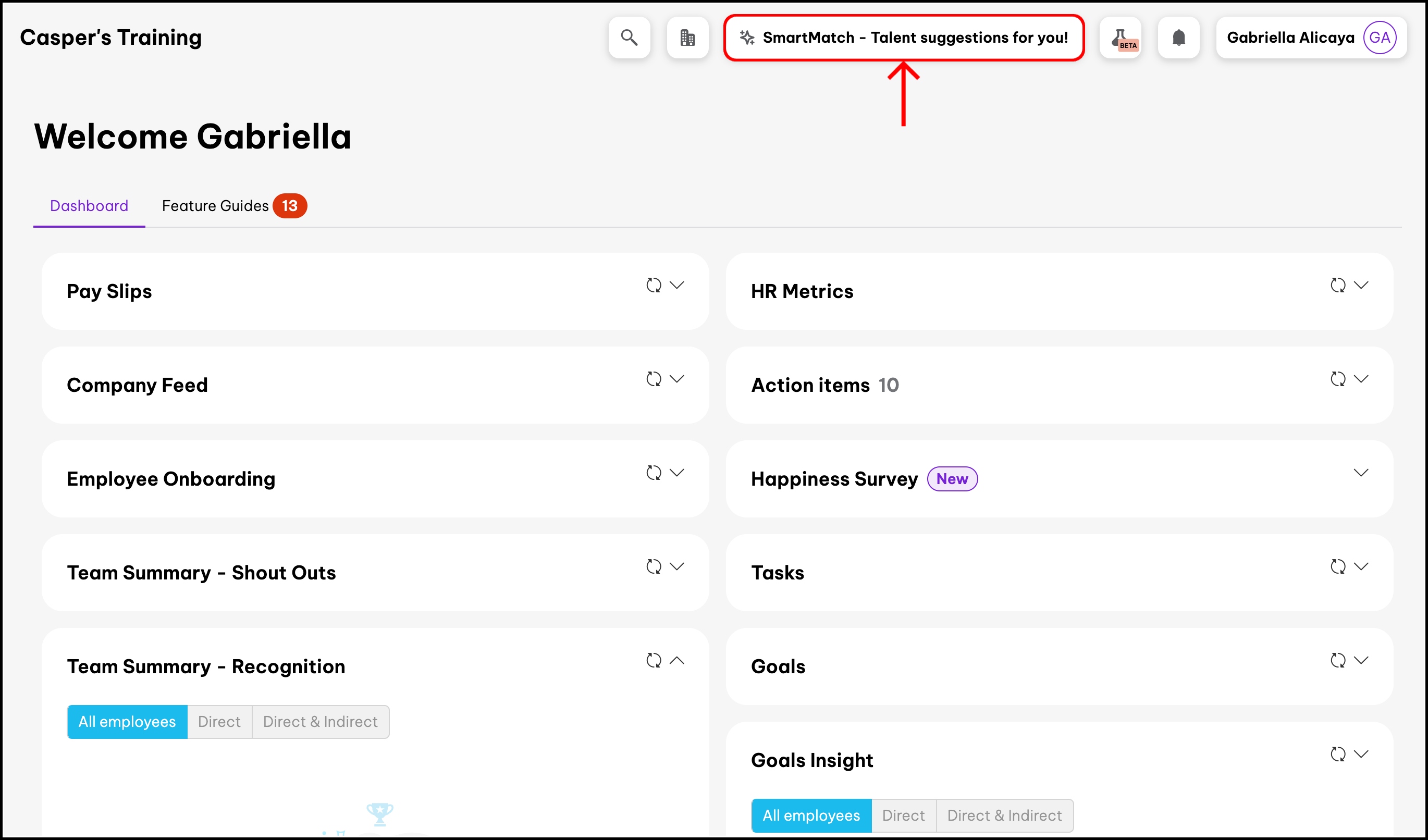 screenshot of the HR platform, highlighting the smart match button in the upper right corner