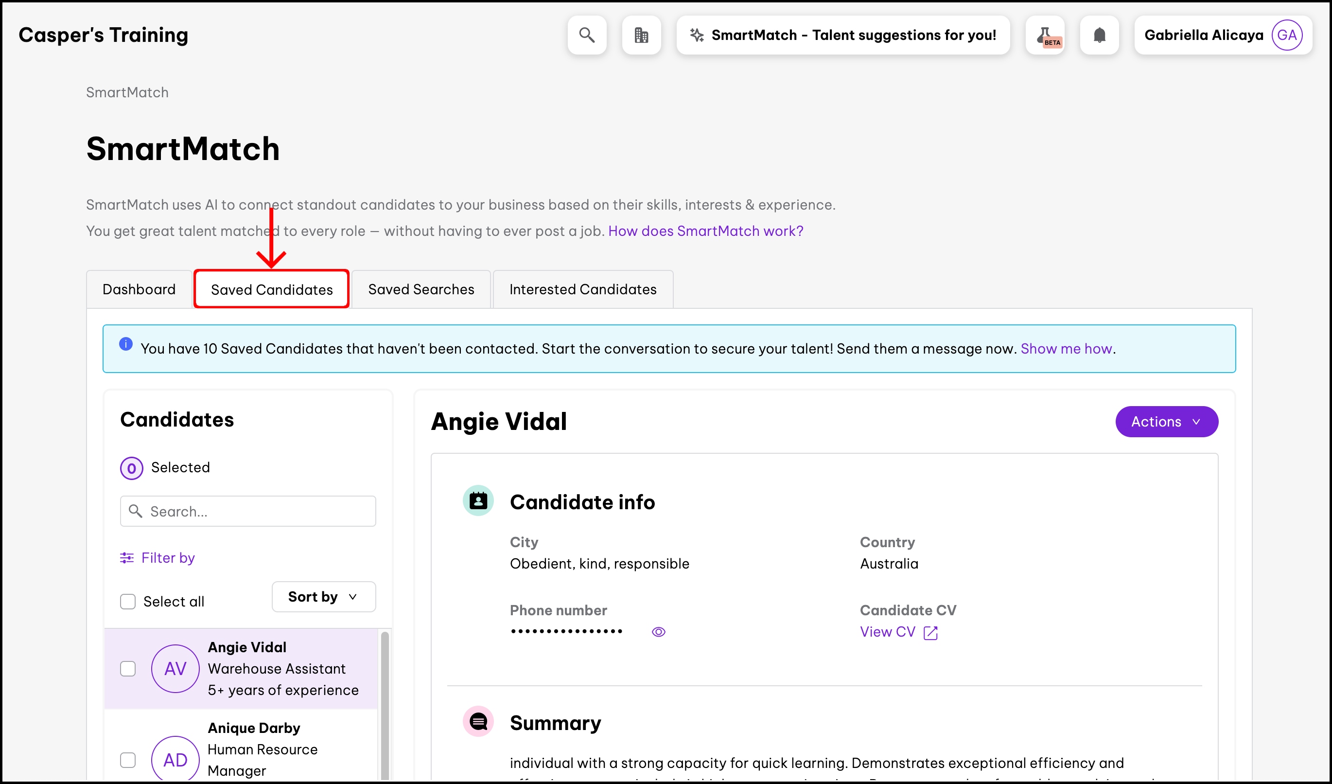 screenshot of the SmartMatch saved candidates tab