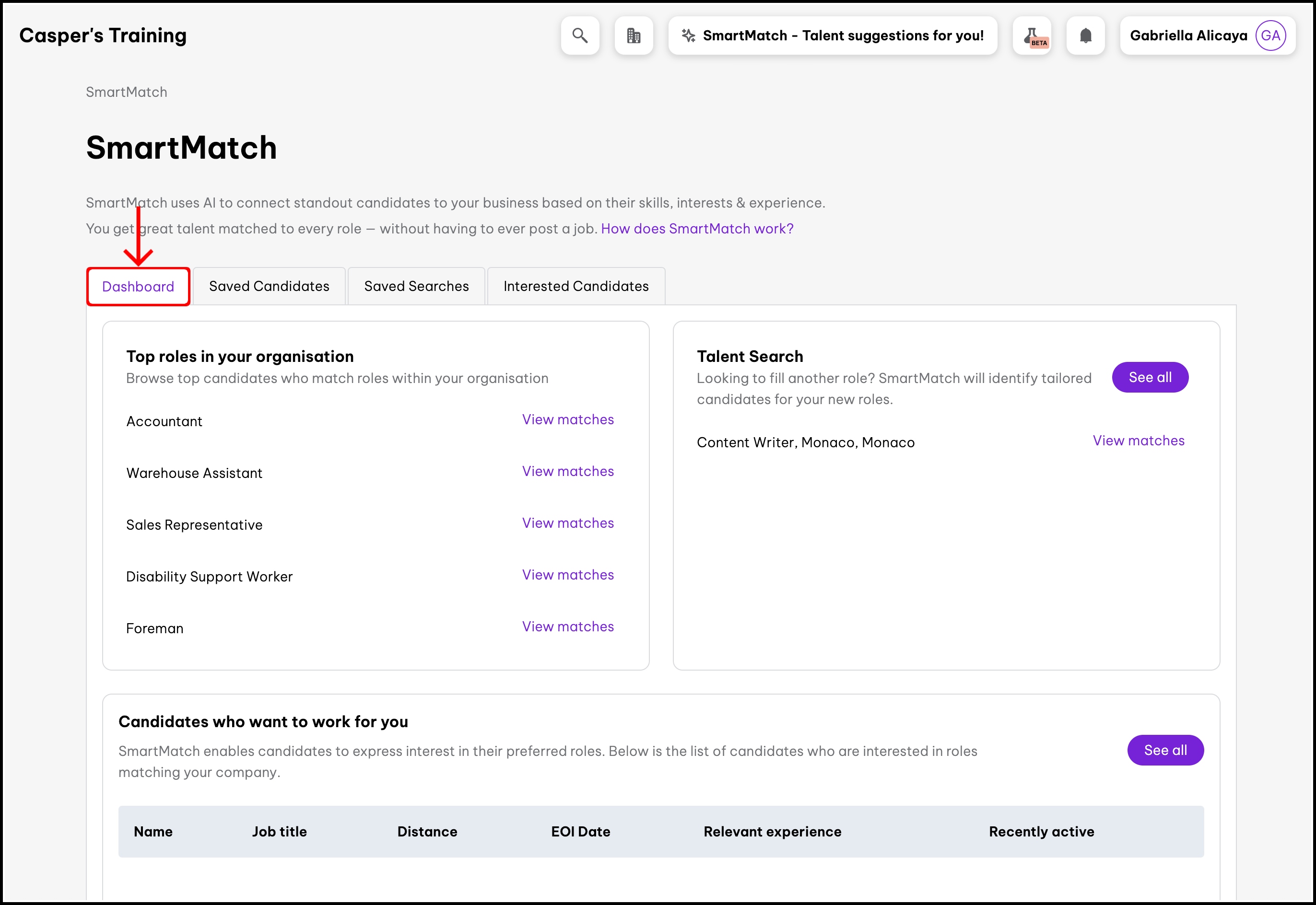 1. Top roles in your organisation - Here, you can see the candidate matches for active jobs in your organisation. To see talent matches for a role, you can click the View matches button beside the job you need.