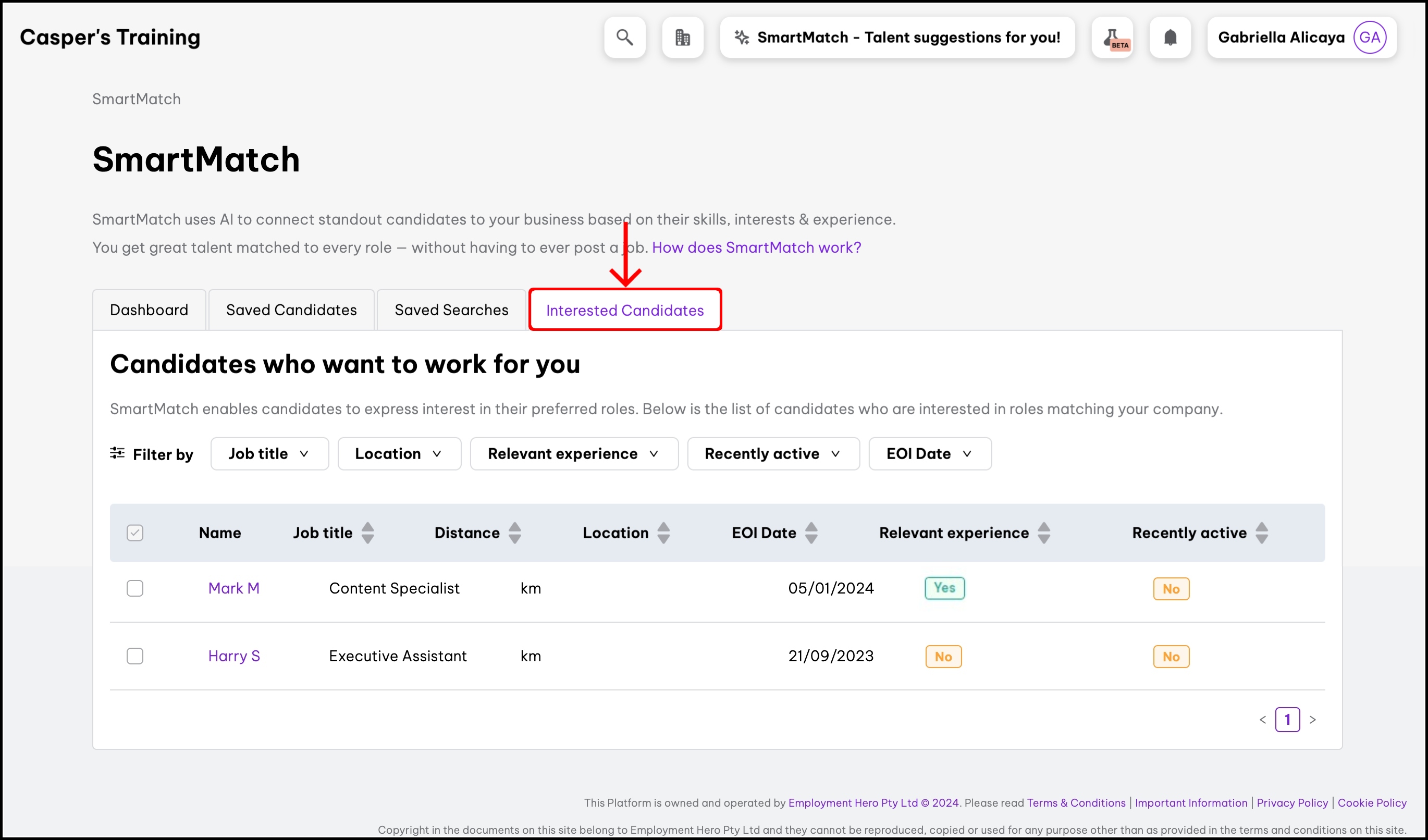 Candidates can express interest in their preferred roles using Employment Hero Work Jobs. Talents who express interest in jobs matching your organisation, they will appear in the Interested Candidates tab.